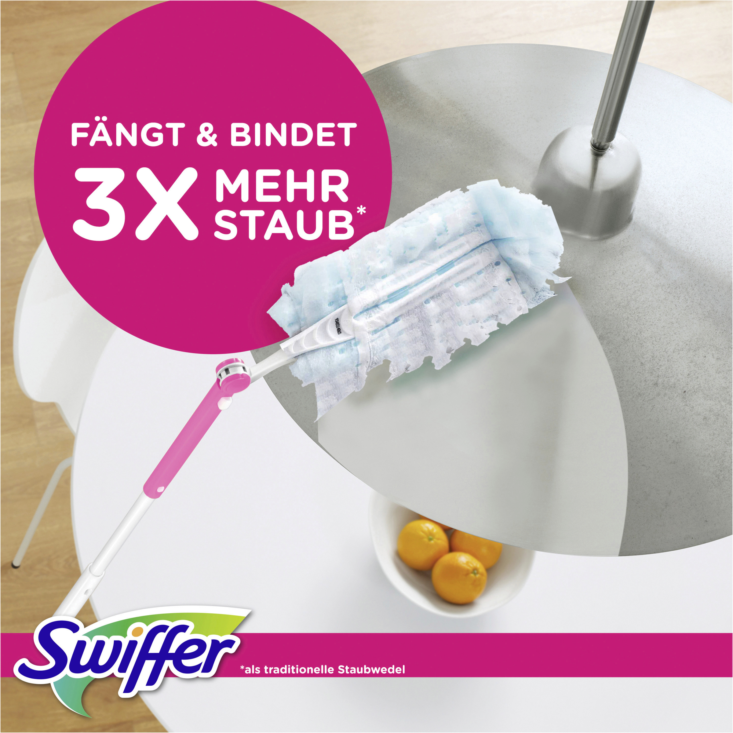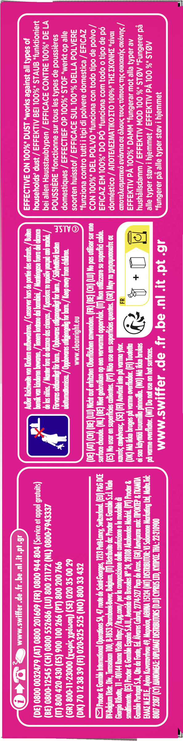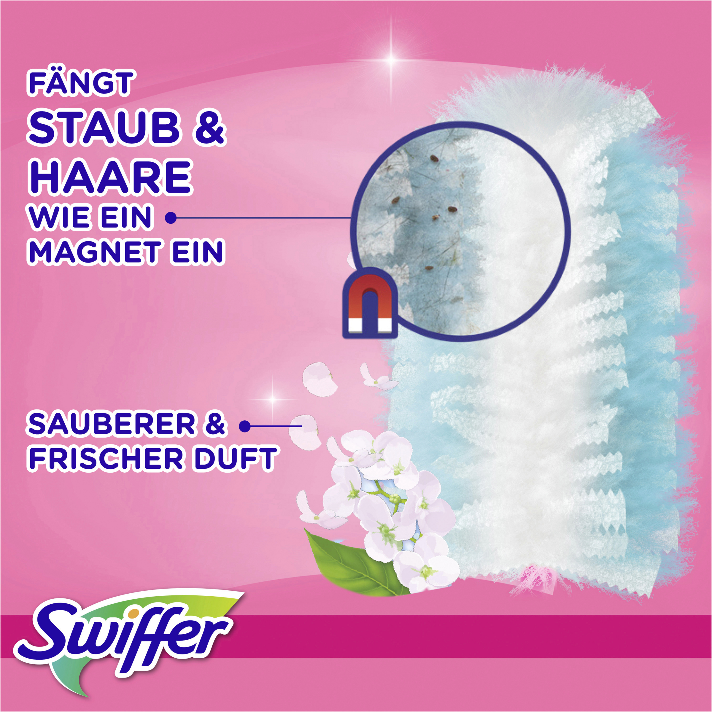 Swiffer Staubmagnet Nachfülltücher lassen dank ihrer Tausenden flauschigen Fasern, die Staub, Schmutz und Haare wie ein Magnet auf allen Oberfläche anziehen, Staub keine Chance (funktioniert bei allen Arten von Hausstaub) – das sogar an schwer zugänglichen Stellen und ohne ihn zu verteilen. Schütteln Sie einfach Ihren Swiffer Staubmagneten auf und schon kann das Putzen weitergehen! Mit Swiffer wird Staubwischen zum Vergnügen! Die Swiffer Staubmagnet Nachfülltücher sind sowohl mit dem kurzen als auch mit dem XXL-Griff kompatibel.