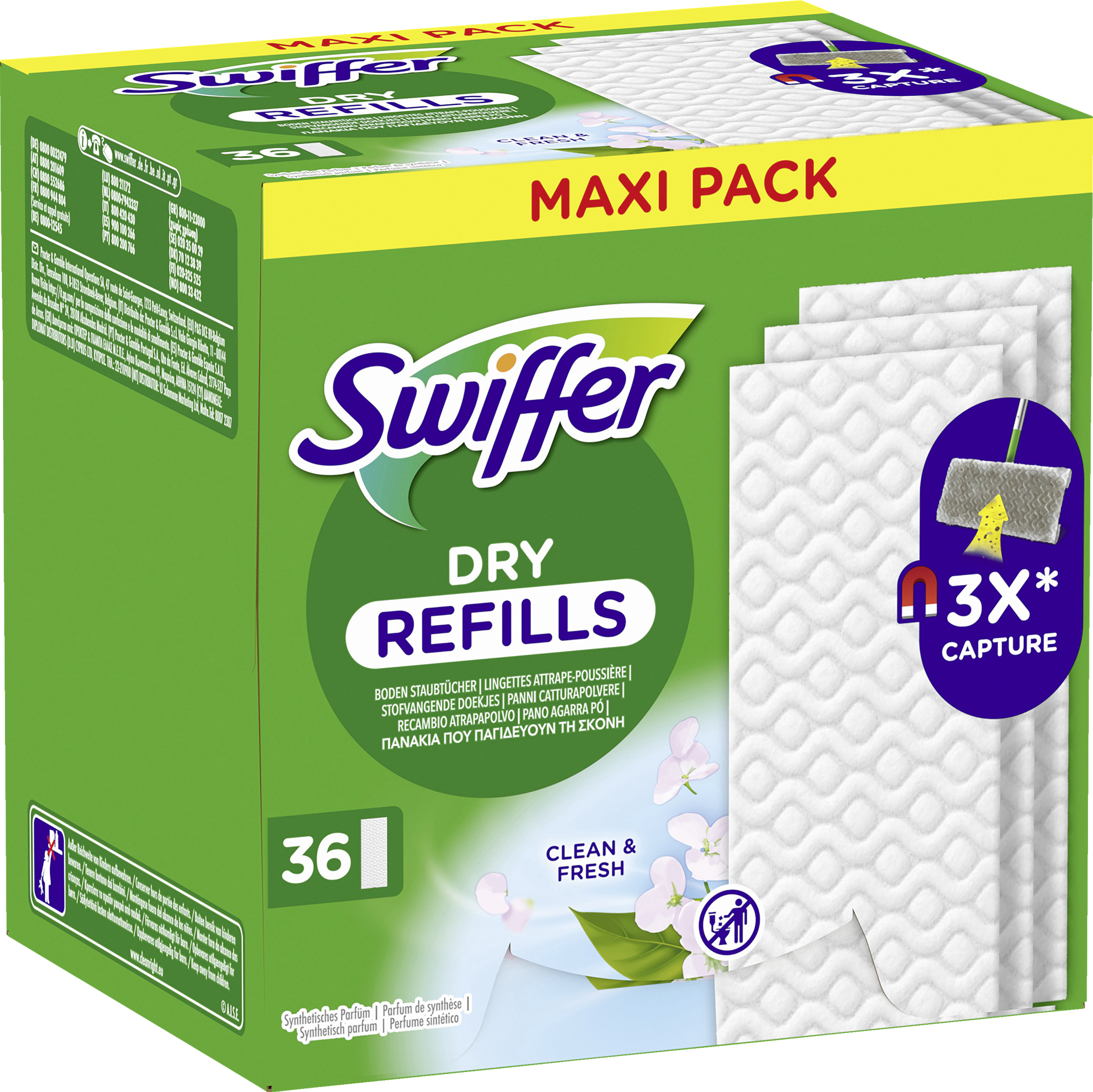 Swiffer Dry Nachfülltücher Clean & Fresh können mit dem Bodenwischer verwendet werden, um Staub, Schmutz und Haare von jeder Art Bodenfläche in Ihrem Zuhause einzufangen und einzuschließen. Dabei sind sie 3-mal effektiver als ein herkömmlicher Besen und hinterlassen außerdem einen schönen frischen Duft auf Ihren Böden. Mit dem Swiffer Dry können Sie Ihr Zuhause im Handumdrehen, mühelos und geräuschlos wieder sauber bekommen. Die perfekte Lösung, um feinen Staub in kleinen Ecken oder an schwer zugänglichen Stellen wie unter dem Sofa und dem Bett einzufangen, wo Besen und Staubsauger nicht immer hinkommen. Die Dichte, spezifische Oberflächenstruktur und elektrostatische Wirkung der Staubtücher ermöglichen es, den gesamten Staub einzufangen und im Inneren des Tuchs einzuschließen. Dabei hinterlassen sie einen langanhaltenden, frischen Duft im Raum. Bodenreinigung war noch nie so schnell und einfach wie mit Swiffer Dry. Guter Tipp: Dieser eignet sich hervorragend zum Entfernen von Tierhaaren, die unsere Haustiere ständig verlieren, sowie für Hausstauballergiker. Swiffer Bodentücher können auf allen harten Oberflächen eingesetzt werden: auf gewachstem oder ungewachstem Linoleum, Vinyl, Keramik und behandelten Holzböden.