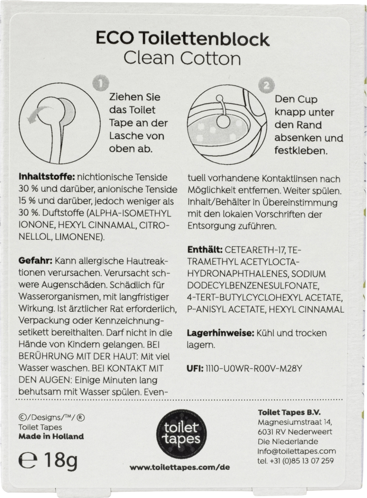 Toilet Tapes – For a happy toilet. Toilet Tapes „Clean Cotton“ verbreiten einen wunderbaren Duft nach frisch gewaschener Baumwolle. Die nachhaltigere Variante eines WC-Steins.