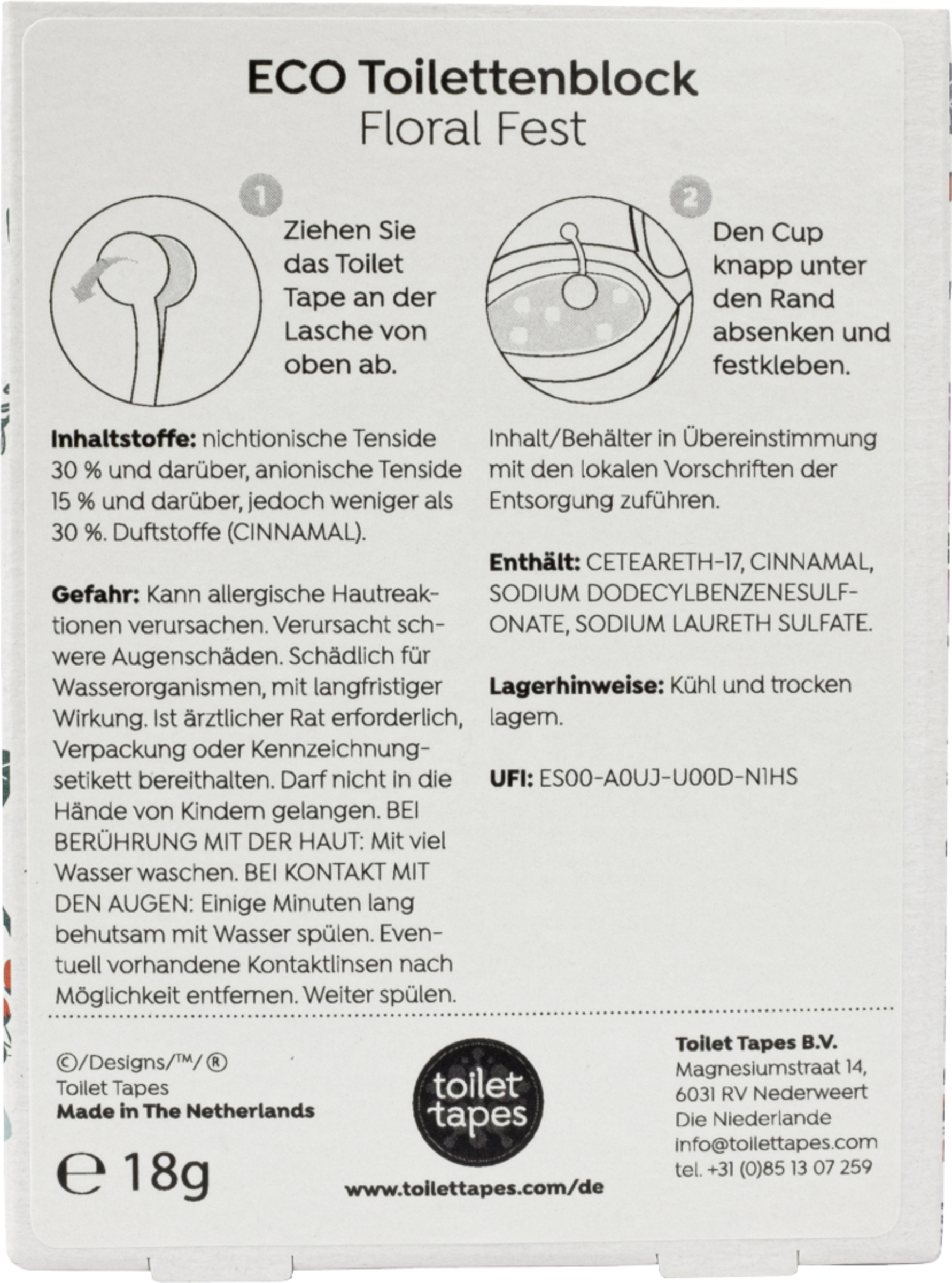 Toilet Tapes sind sehr einfach zu verwenden. Aufgrund des einzigartigen hygienischen Klebestreifens ist ein Toilet Tape schnell und einfach an der Toilette angebracht. Ob gewöhnliche Toilette, eine Toilette mit hohem Rand oder eine randlose Toilette: Toilet Tapes passen immer! Ziehe das Klebestreifen vom Transportband ab und senke den Toilettenstein entlang der Innenseite bis knapp unter den Toilettenrand ab. Klebe dann den Streifen auf den Rand und das Toilet Tape ist bereit für die Spülung. Du wirst feststellen, dass sich mit jeder Spülung ein wohlriechender Duft in dem ganzen Badezimmer verbreitet. Der kräftige Schaum der Toilet Tapes sorgt ebenfalls für eine starke Reinigungswirkung.