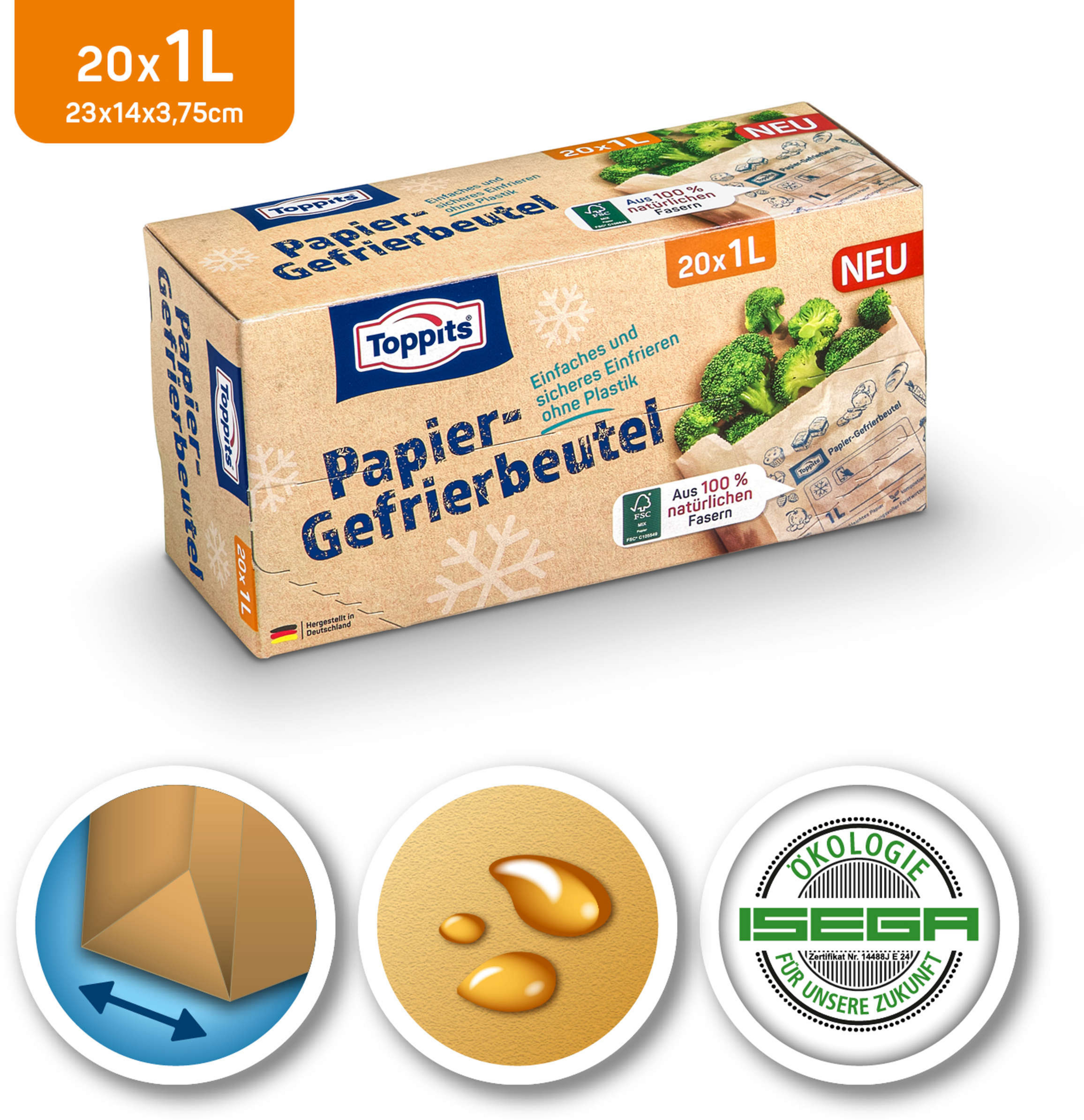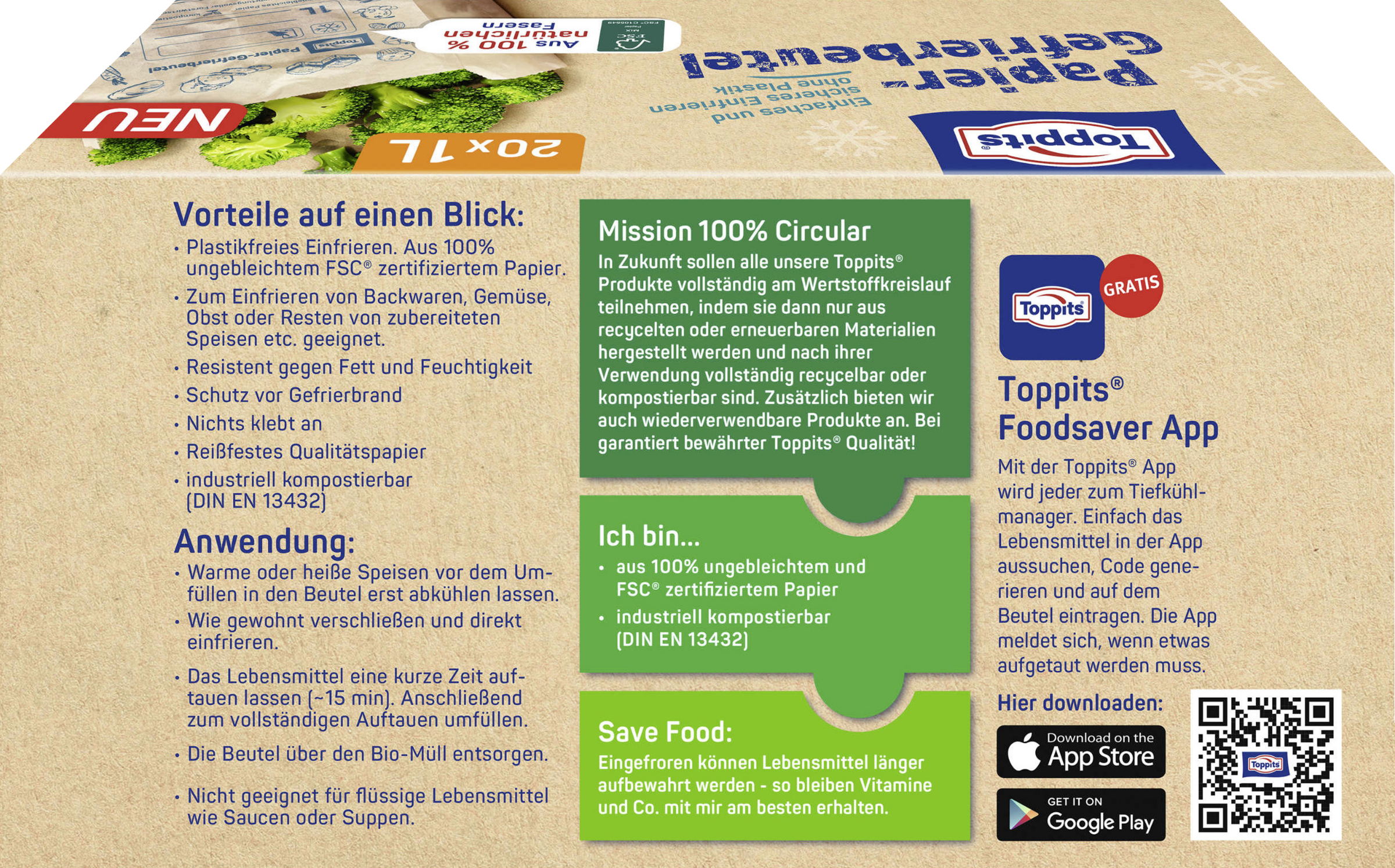 In Zukunft sollen alle unsere Toppits@ Produkte vollständig am Wertstoffkreislauf teilnehmen, indem sie dann nur aus recycelten oder erneuerbaren Materialien hergestellt werden und nach ihrer Verwendung vollständig recycelbar oder kompostierbar sind. Zusätzlich bieten wir auch wiederverwendbare Produkte an. Bei garantiert bewährter Toppits0 Qualität, Save Food: Eingefroren können Lebensmittel länger aufbewahrt werden - so bleiben Vitamine und Co. mit mir am besten erhalten.Vorteile auf einen Blick: