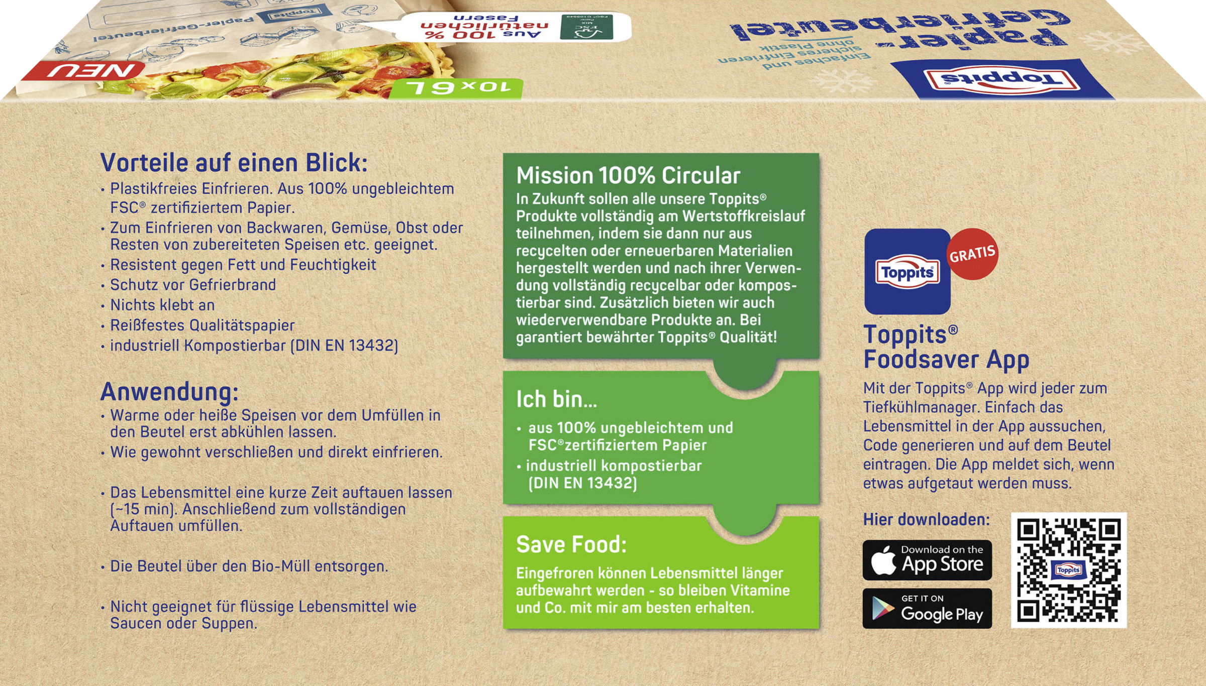 In Zukunft sollen alle Toppits@ Produkte vollständig am Wertstoffkreislauf teilnehmen, indem sie dann nur aus recycelten oder erneuerbaren Materialien hergestellt werden und nach ihrer Verwendung vollständig recycelbar oder kompostierbar sind. Zusätzlich bieten sie auch wiederverwendbare Produkte an. Bei garantiert bewährter Toppits0 Qualität, Save Food: Eingefroren können Lebensmittel länger aufbewahrt werden - so bleiben Vitamine und Co. mit mir am besten erhalten.