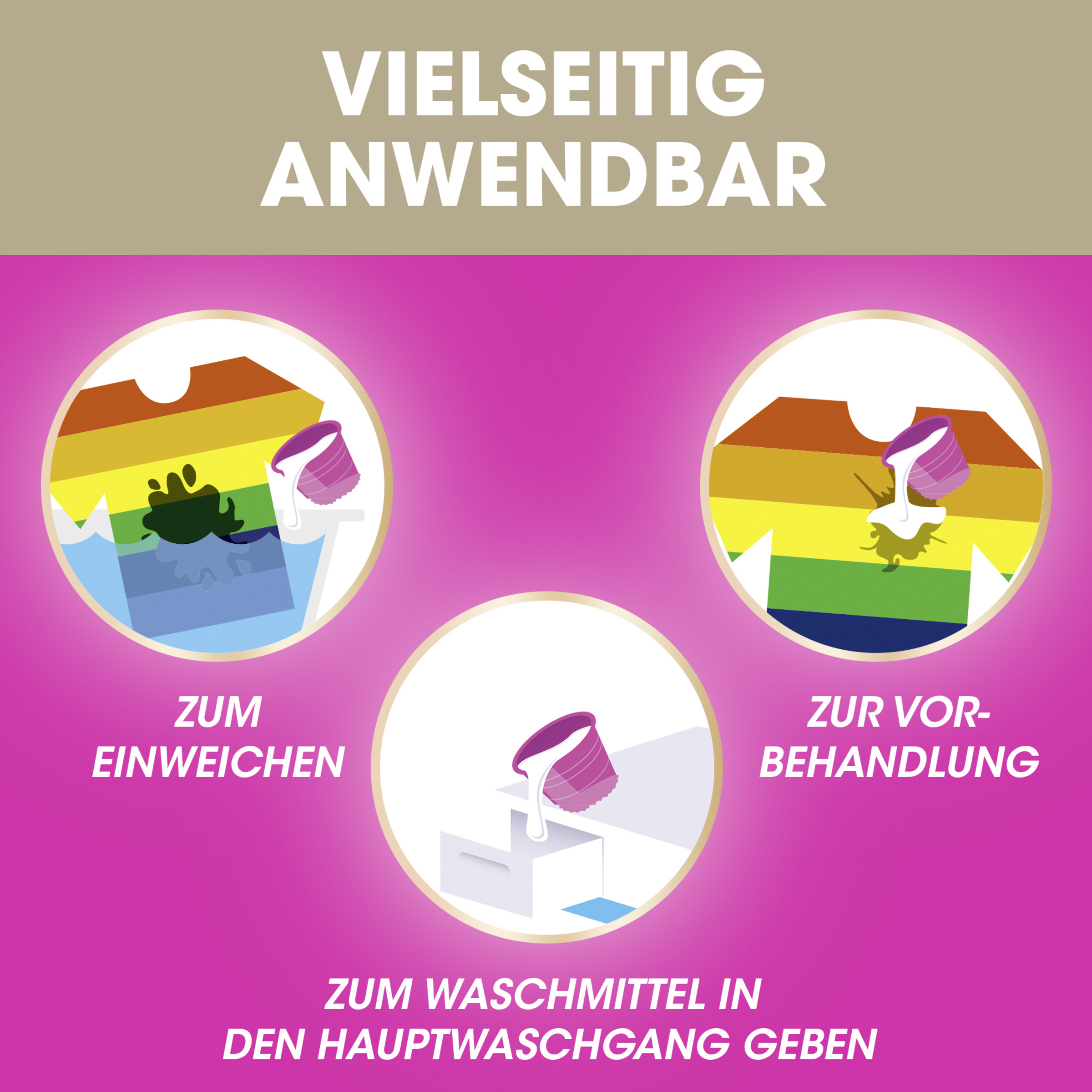 Nicht auf Textilien oder Teppichen aus Wolle, Seide oder Leder verwenden. Nicht auf versiegelten oder behandelten Oberflächen anwenden (Z. B. Holz, Metall, usw.) Textilien mit Metallteilen (z. B. Reisverschlüssen, Nieten) oder flammensicherer Oberfläche nicht einweichen. Vorbehandelte oder eingeweichte Textilien keinen direkten Wärmequellen oder direktem Sonnenlich aussetzen, bevor diese nicht gewaschen oder gründlich ausgespült wurden. Produkt in der Packung nicht verunreinigen. In Wasser gelöstes Produkt nicht im geschlossenen Behälter verwahren. Lösung gibt weiterhin Sauerstoff ab und Behälter könnte undicht werden. Bei empfindlicher Haut empfiehlt sich das Tragen von Haushaltshandschuhen.
