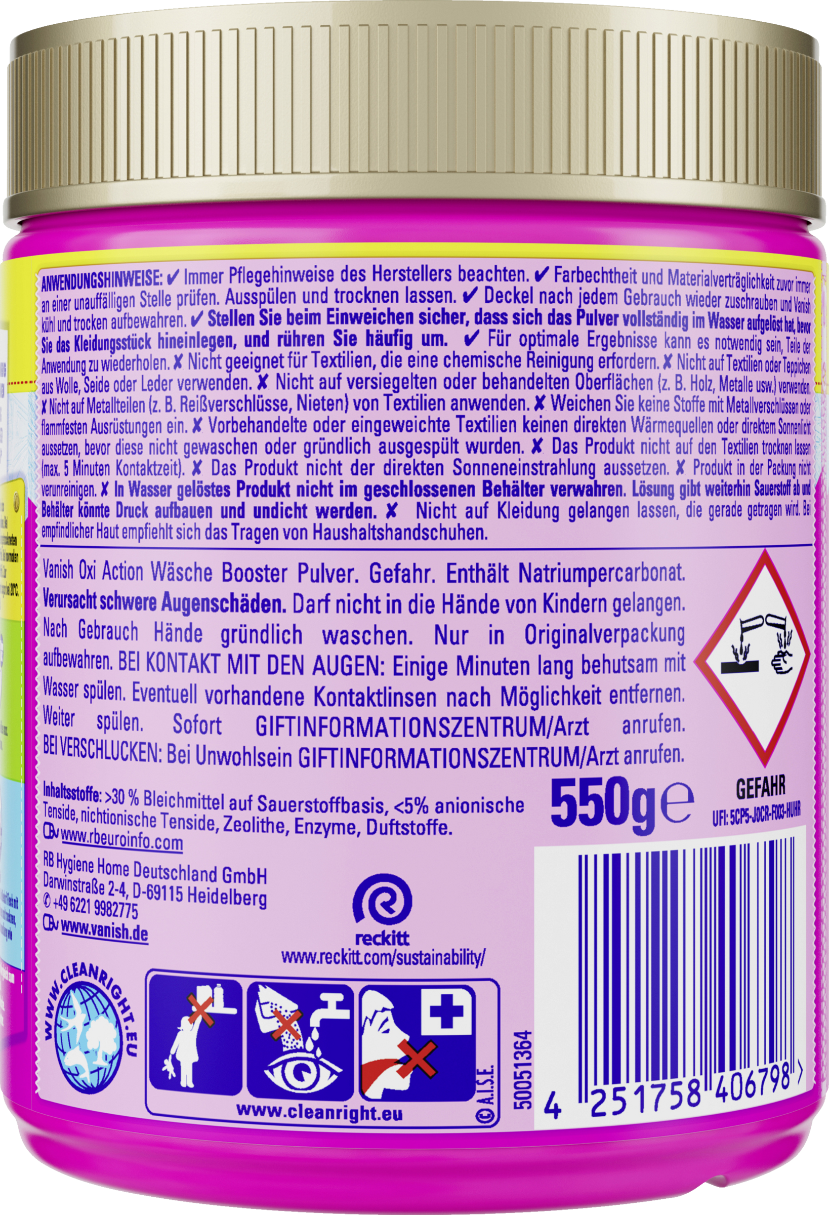 Enthält Natriumpercabonat. Verursacht schwere Augenschäden. Verursacht Hautreizungen. Ist ärztlicher Rat erforderlich, Verpackung oder Kennzeichnungsetikett bereithalten. Darf nicht in die Hände von Kindern gelangen. Nach Gebrauch Hände gründlich waschen.BEI KONTAKT MIT DEN AUGEN: Einige Minuten lang behutsam mit Wasser spülen. Eventuell vorhandene Kontaktlinsen nach Möglichkeit entfernen. Weiter spülen. Sofort GIFTINFORMATIONSZENTRUM oder Arzt anrufen. BEI VERSCHLUCKEN: Bei Unwohlsein GIFTINFORMATIONSZENTRUM oder Arzt anrufen.