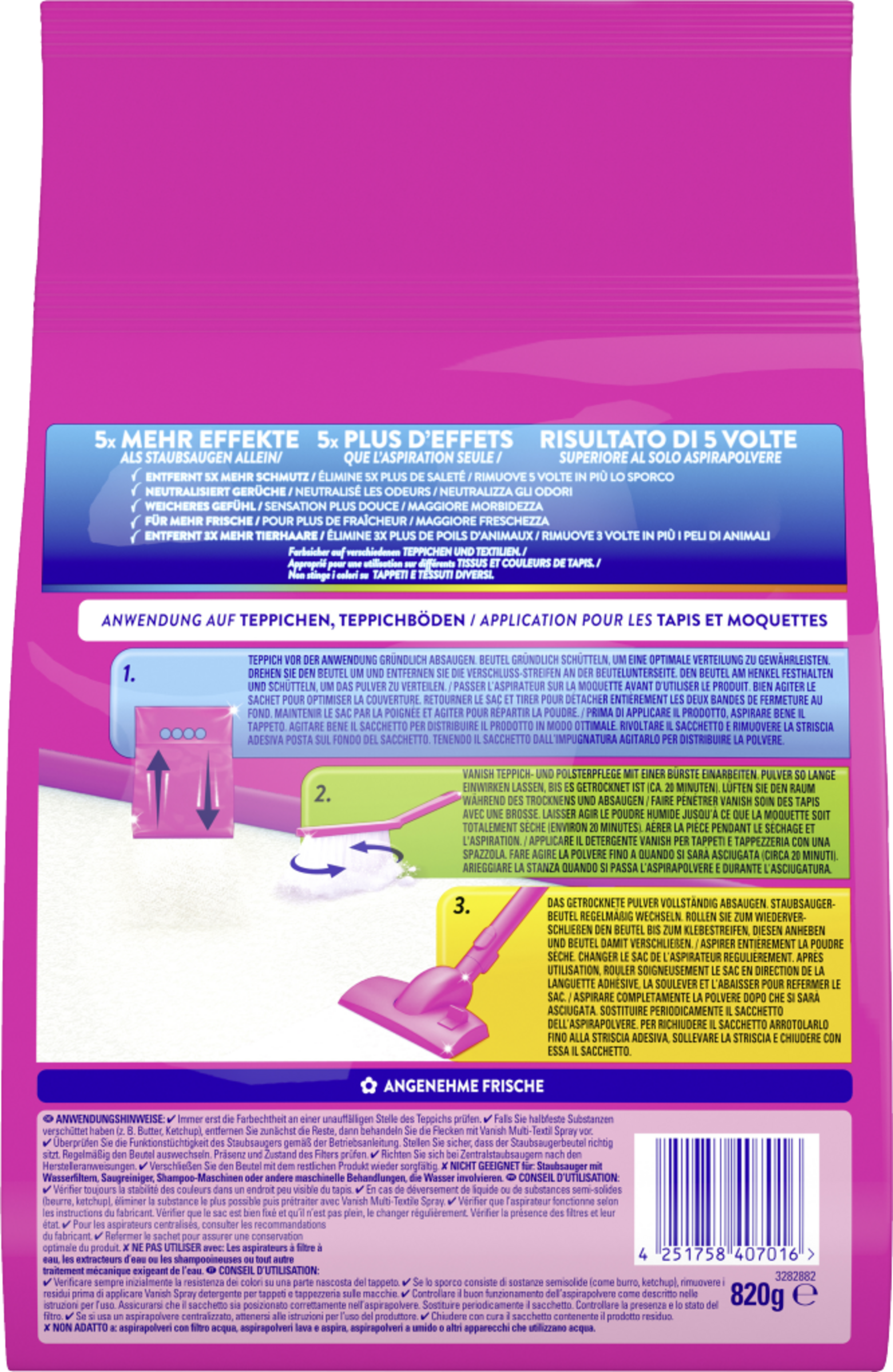 Immer erst die Farbechtheit an einer unauffälligen Stelle des Teppich prüfen. Falls Sie halbfeste Substanzen verschüttet haben (z.B. Butter, Ketchup) entfernen Sie zunächst die Reste, dann behandeln Sie die Flecken vor. Überprüfen Sie die Funktionstüchtigkeit des Staubsaugers gemäß der Betriebsanleitung. Stellen Sie sicher, dass der Staubsaugerbeutel richtig sitzt. Regelmäßig den Beutel auswechseln. Präsenz und Zustand des Filters prüfen. Richten Sie sich bei Zentralstaubsaugern nach den Herstelleranweisungen. Verschließen Sie den Beutel mit dem restlichen Produkt wieder sorgfältig. NICHT GEEIGNET für: Staubsauger mit Wasserfiltern, Saugreinigern, Shampoo-Maschinen oder andere maschinelle Behandlungen, die Wasser involvieren.