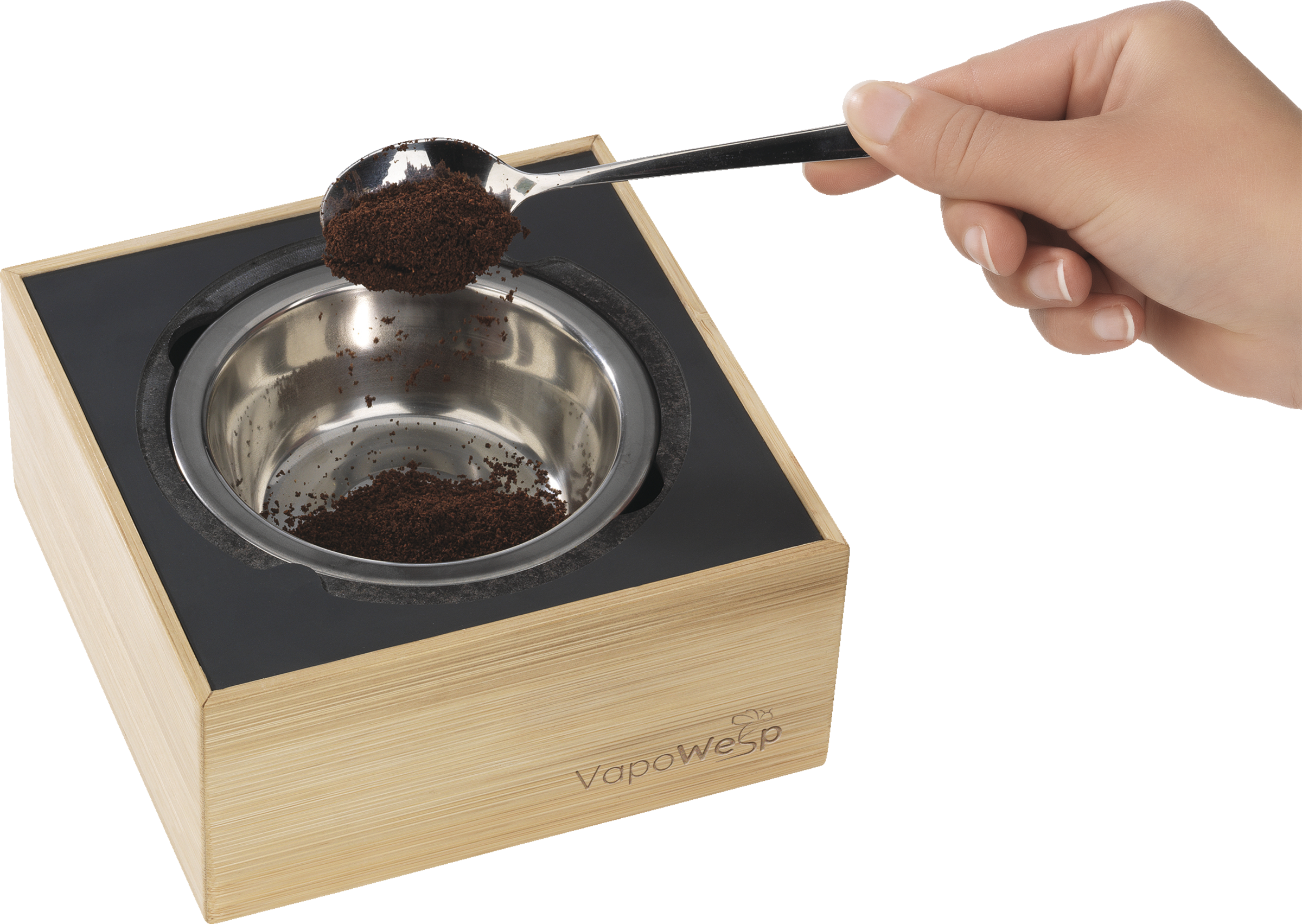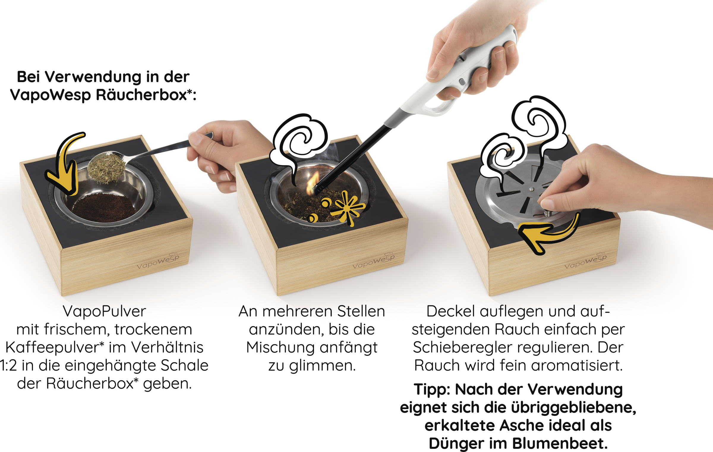 VapoPulver mit frischem, trockenem Kaffeepulver* im Verhältnis 1:2 in die eingehängte Schale der Räucherbox* geben. An mehreren Stellen anzünden,bis die Mischunganfängt zu glimmen. Deckel auflegen & aufsteigenden Rauch einfach per Schieberegler regulieren. Der Rauch wird fein aromatisiert.