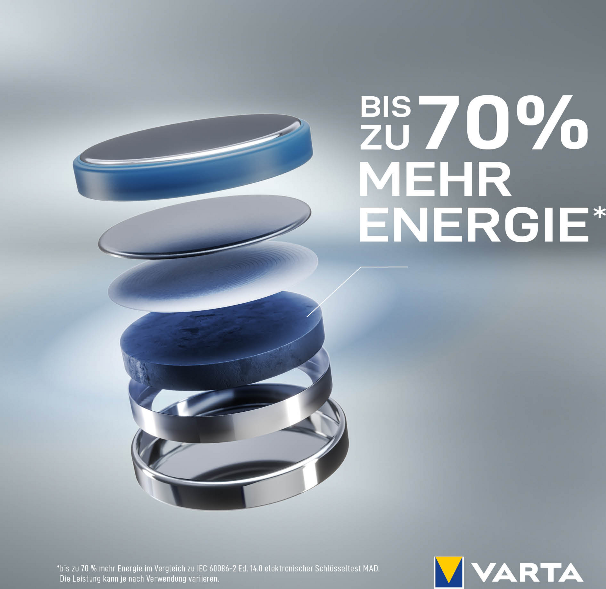 *bis zu 70% mehr Energie vs. IEC 60086-2 Ed.14.0 elektronischer Schlüssel Test MAD. Leistung kann je nach Anwendung variieren.