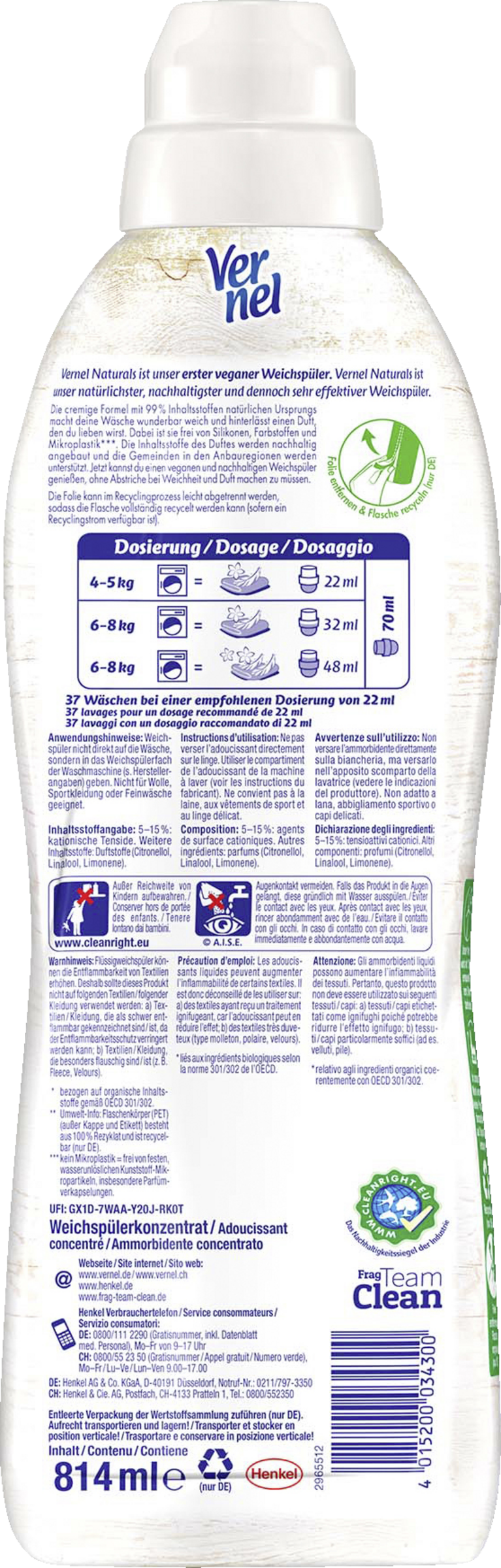 VERNEL Naturals Weichspüler Ylang Ylang & Süßgras – Der natürliche & nachhaltige VERNEL Weichspüler VERNEL Naturals ist ein natürlicher, nachhaltiger und dennoch ein sehr effektiver Weichspüler. Gleichzeitig ist er der erste vegane Weichspüler von Vernel**. Die cremige Formel mit 99 % Inhaltsstoffen natürlichen Ursprungs macht deine Wäsche wunderbar weich und hinterlässt einen Duft, den du lieben wirst. Die Naturals Serie ist frei von Silikonen, Farbstoffen und Mikroplastik*. Der Duft nach Ylang Ylang und Süßgras erhält seine Inhaltsstoffe aus nachhaltigem Anbau und die Gemeinden in den Anbauregionen werden unterstützt.Jetzt kannst du einen veganen** und nachhaltigen Weichspüler genießen, ohne Abstriche bei Weichheit und Duft machen zu müssen. Gleichzeitig wird der VERNEL Weichspüler Naturals in einer Flasche aus 100 % recyceltem Plastik geliefert. Die Folie kann im Recyclingprozess leicht abgetrennt werden, sodass die Flasche vollständig recycelt werden kann (sofern ein Recyclingstrom verfügbar ist).