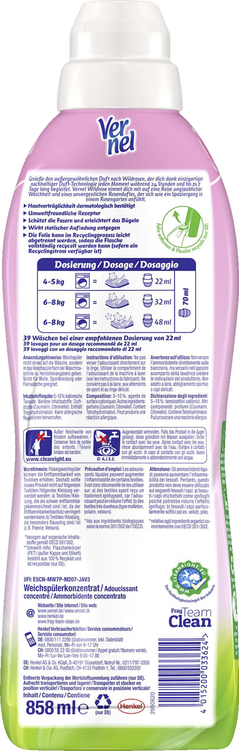 Gleichzeitig enthält der VERNEL Weichspüler Wildrose 97 % biologisch abbaubare Inhaltsstoffe*. Die Folie kann im Recyclingprozess leicht abgetrennt werden, sodass die Flasche vollständig recycelt werden kann (sofern ein Recyclingstrom verfügbar ist).