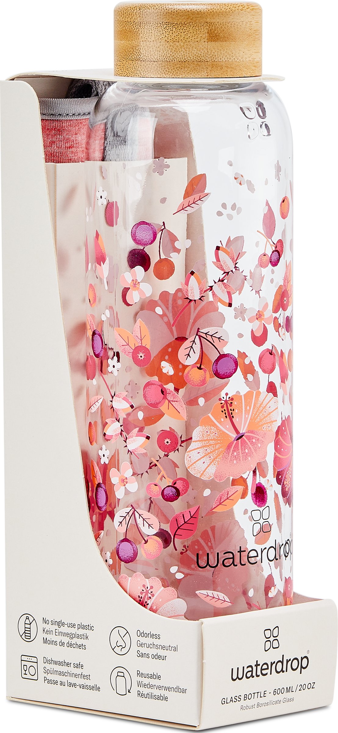 Die waterdrop® Glas-Trinkflasche (600 ml) hilft dir dabei auch unterwegs mehr Wasser zu trinken und einen Beitrag zur Verringerung deines CO2 Footprints zu leisten.