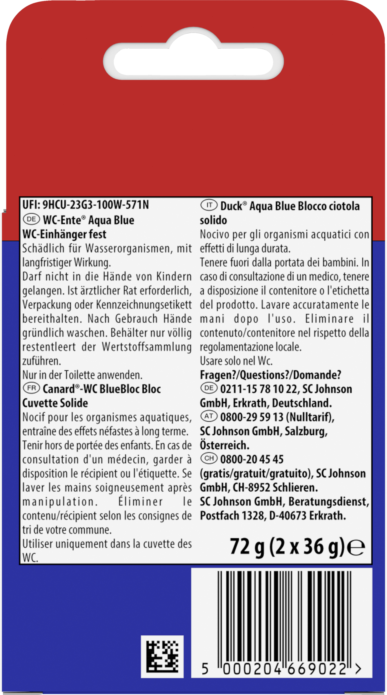 Nachfüller für den WC-Ente AquaBlue 4in1 Einhänger. Der WC-Ente AquaBlue 4in1 Einhänger färbt das Wasser mit jeder Spülung meeresblau! Die spezielle Form des WC-Ente AquaBlue 4in1 Einhängers sorgt dafür, dass Ihr WC mit jeder Spülung gleichmäßig erfrischt wird.