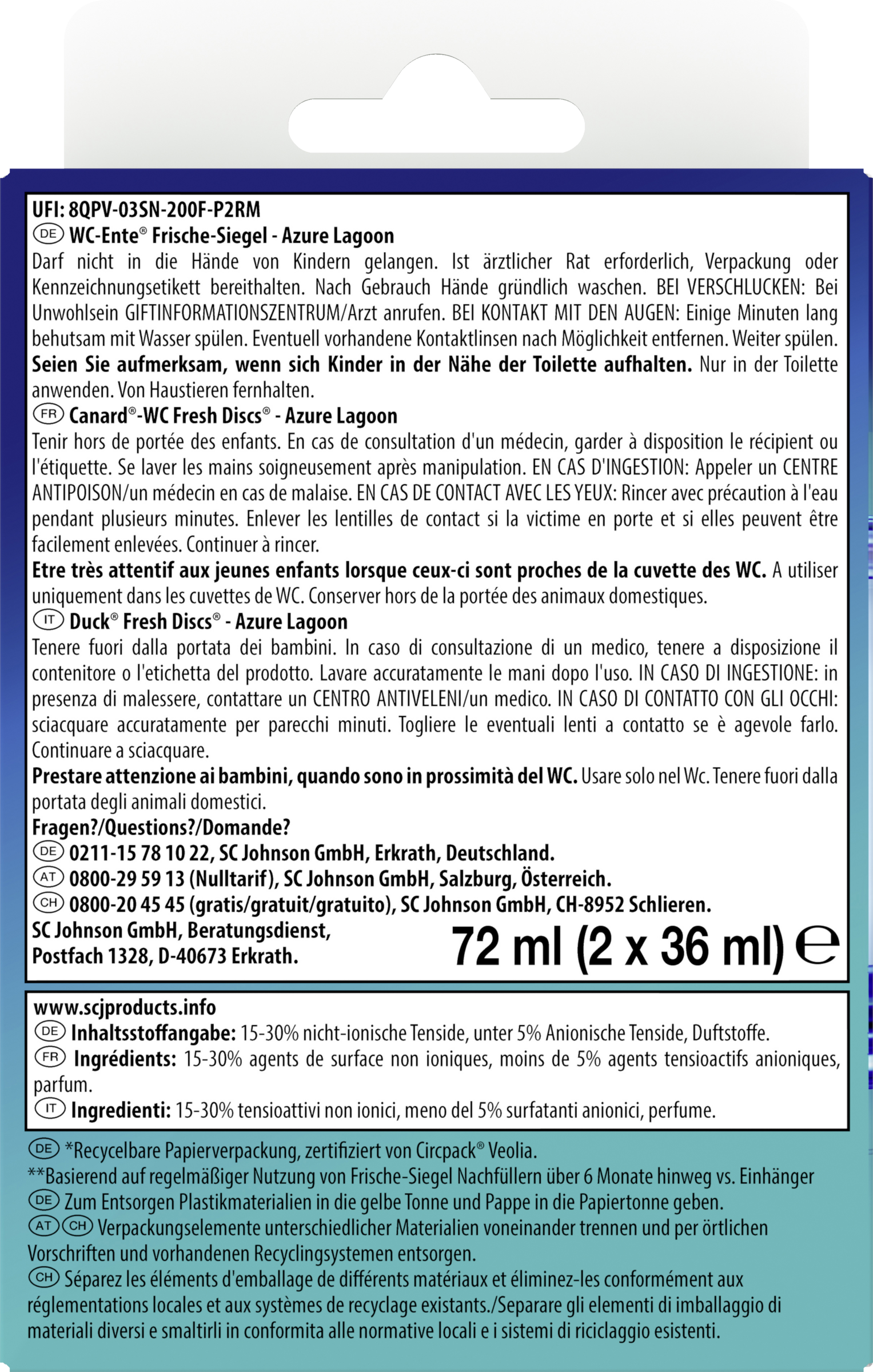 Der WC-Ente Frische-Siegel Nachfüller (2 Nachfüller mit jeweils 6 Siegeln) passt in den Original Spendergriff des WC-Ente Frische-Siegel Starterpacks, die innovative und dezente Alternative zum klassischen WC-Einhänger. Das Frische-Siegel ist das erste Frische-Gel für die Toilette ohne Toiletteneinhänger. Deswegen ist der Toilettenreiniger sowohl für Toiletten mit Spülrand als auch für spülrandlose WCs geeignet. Das WC-Gel an der Innenwand des WC-Beckens wie ein Siegel/Stempel platziert. Es setzt reinigende Substanzen und frischen Toilettenduft bei jeder Spülung frei.