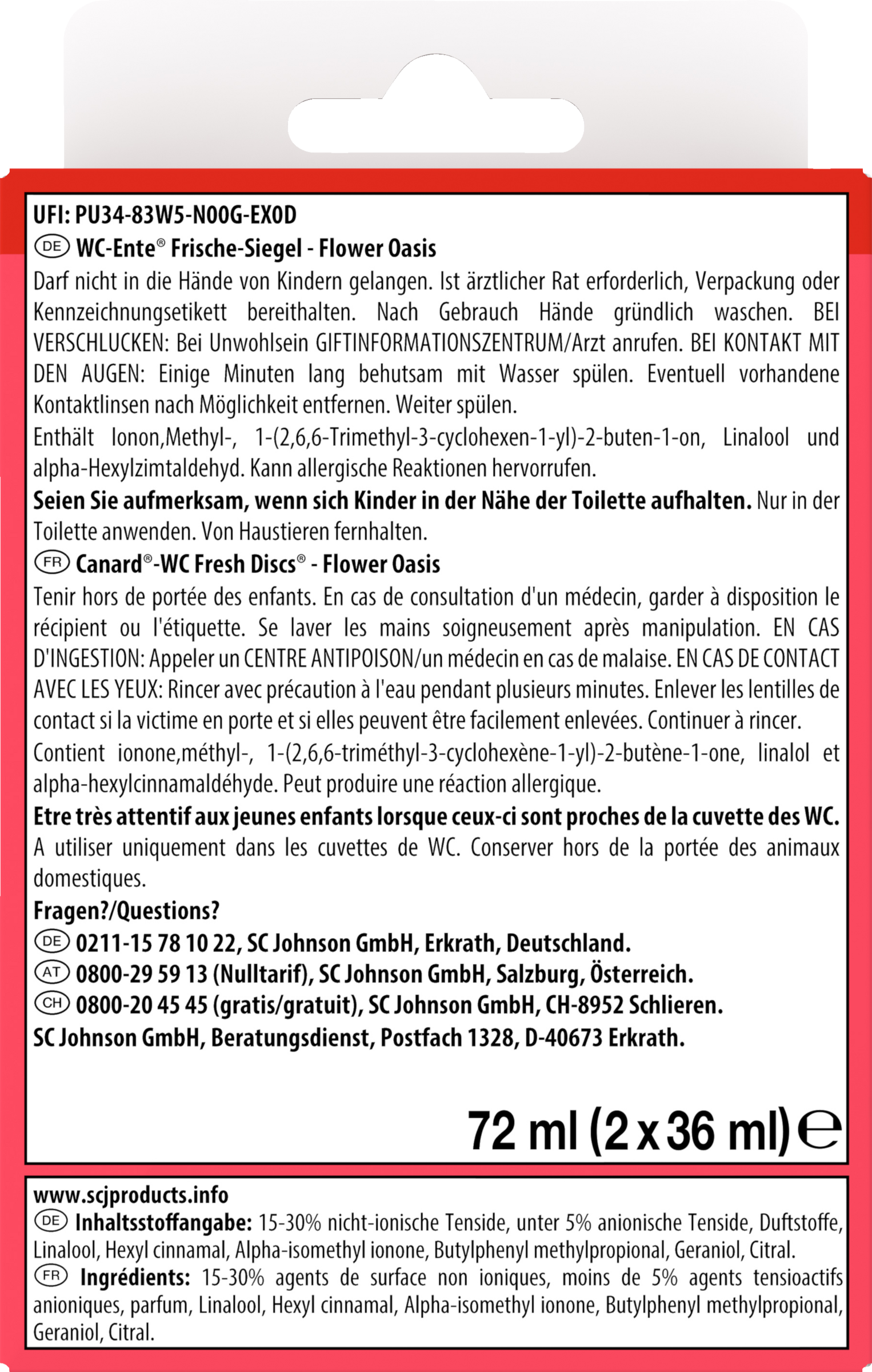 - 4. Abziehen. Den Spender einfach abziehen und das WC-Ente Frische-Siegel haftet im WC-Becken. Spender wieder verschließen. Kann nach dem Anbringen im WC-Becken auf Kinder anziehend wirken. Produkt an einer Stelle anbringen, die für Kinder am wenigsten sichtbar ist. Toilettenspülung benutzen, um das WC-Ente Frische-Siegel zu aktivieren.
