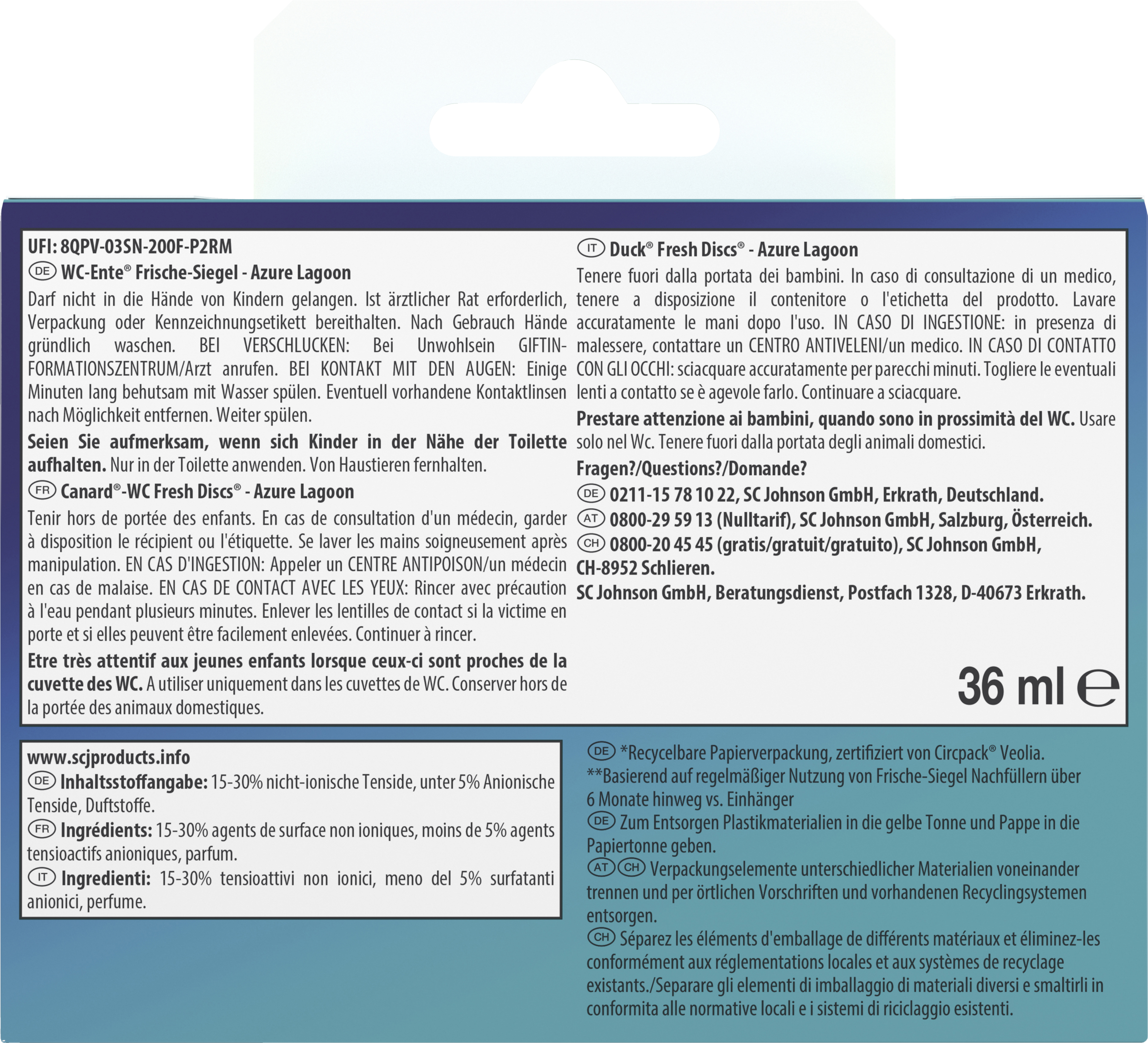 4. Abziehen. Den Spender einfach abziehen und das WC-Ente Frische-Siegel haftet im WC-Becken. Spender wieder verschließen. Kann nach dem Anbringen im WC-Becken auf Kinder anziehend wirken. Produkt an einer Stelle anbringen, die für Kinder am wenigsten sichtbar ist. Toilettenspülung benutzen, um das WC-Ente Frische-Siegel zu aktivieren.