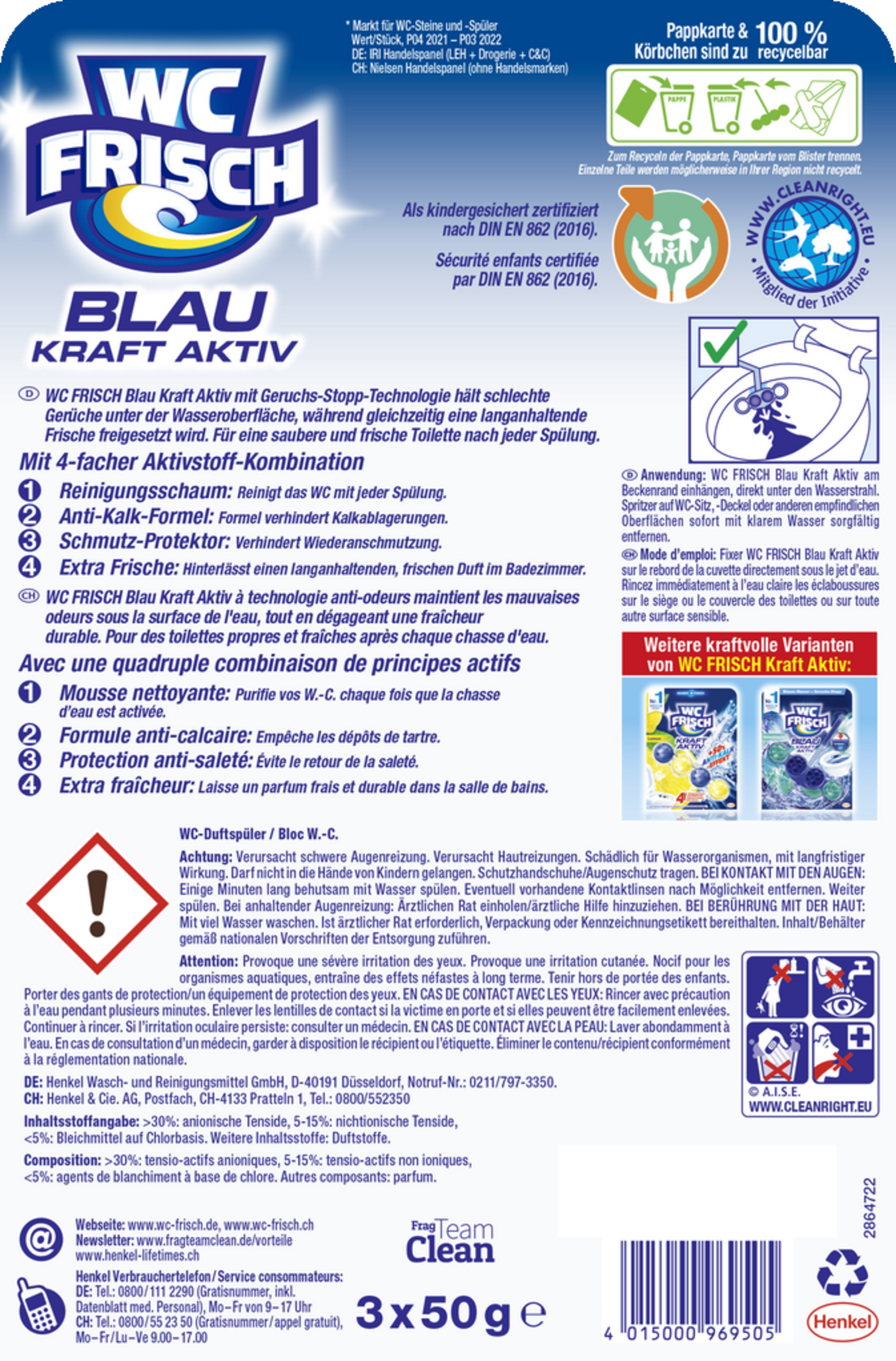 Mit der innovativen WC FRISCH 4-fach Aktivstoff-Kombination schützt WC FRISCH vor Kalkablagerungen und bietet Reinigungsschaum, Schmutz-Protektor und Extra Frische in Ihrer Toilette. Mit seinem dezenten Design und seinen tollen Farben passt unser WC FRISCH perfekt unter den Toilettenrand.