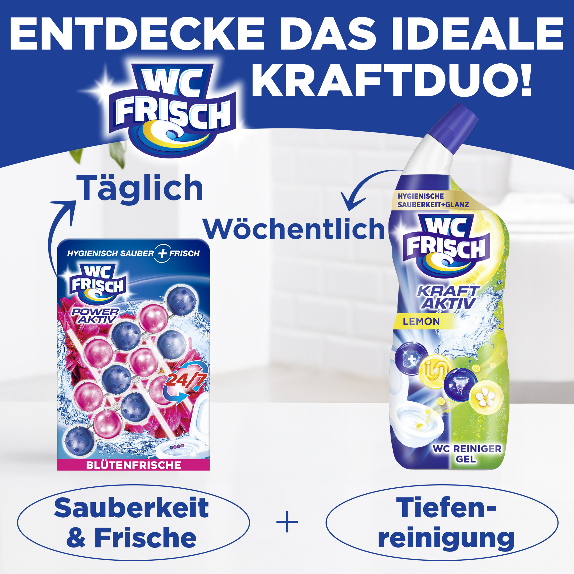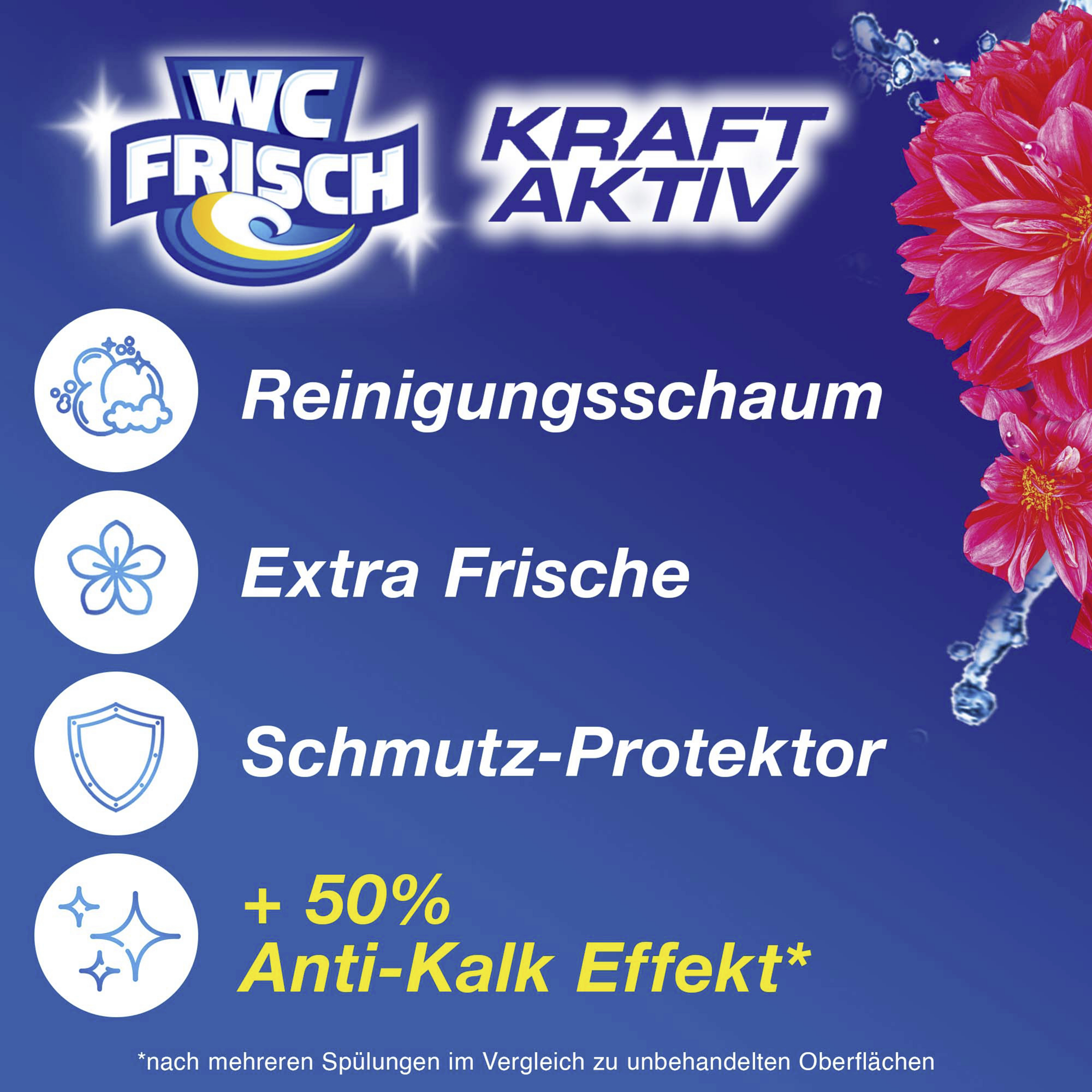 Mit der innovativen WC FRISCH 4-fach Aktivstoff-Kombination schützt WC FRISCH vor Kalkablagerungen und bietet Reinigungsschaum, Schmutz-Protektor und Extra Frische in Ihrer Toilette. Mit seinem dezenten Design und seinentollen Farben passt unser WC FRISCH perfekt unter den Toilettenrand.