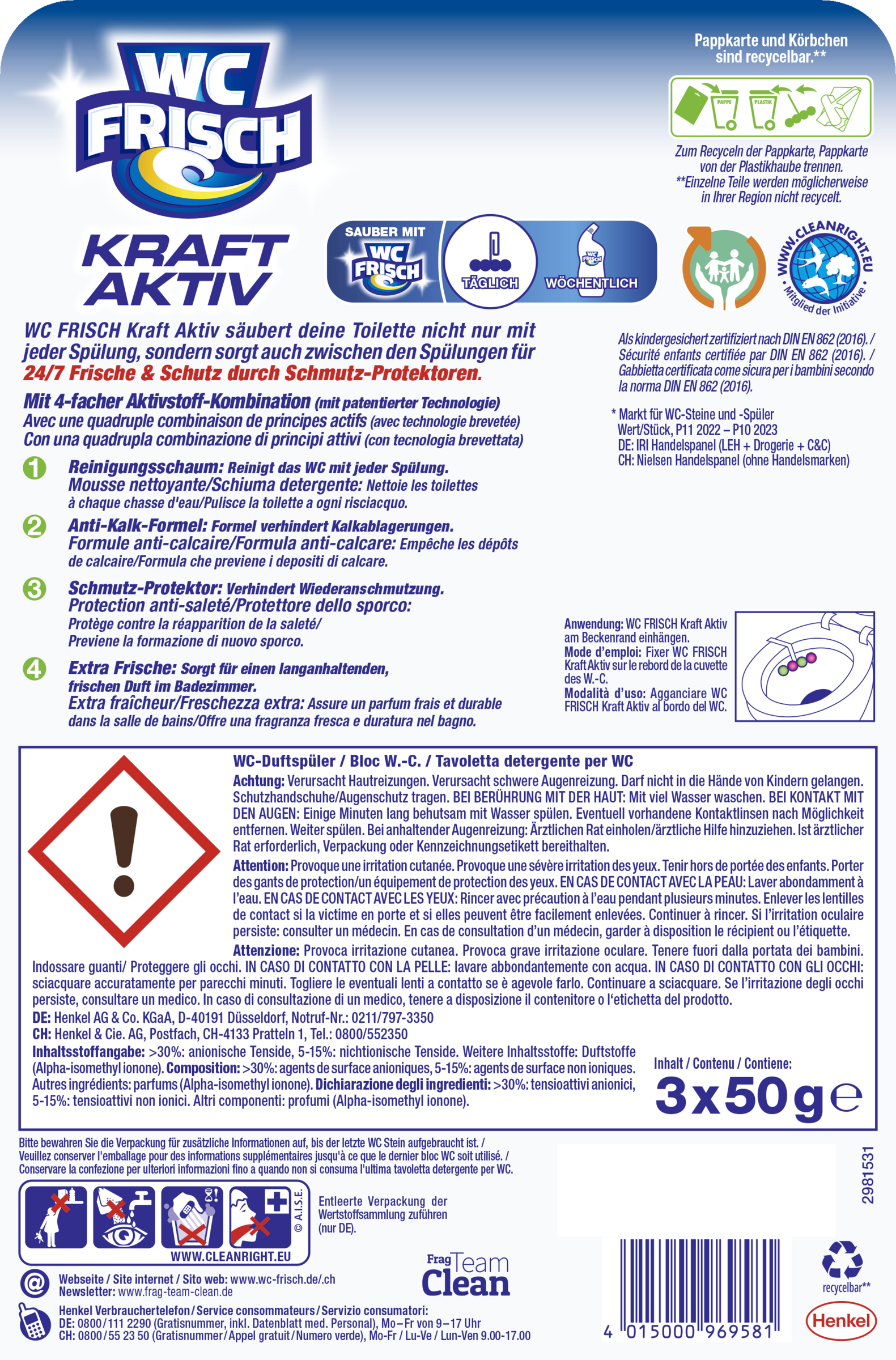 - 4-fach Aktivstoff-Kombination – Der Toilettenspüler bietet dank 4-fach Aktivstoff-Kombination Reinigungsschaum, Anti-Kalk-Formel, Schmutz-Protektor und Extra Frische