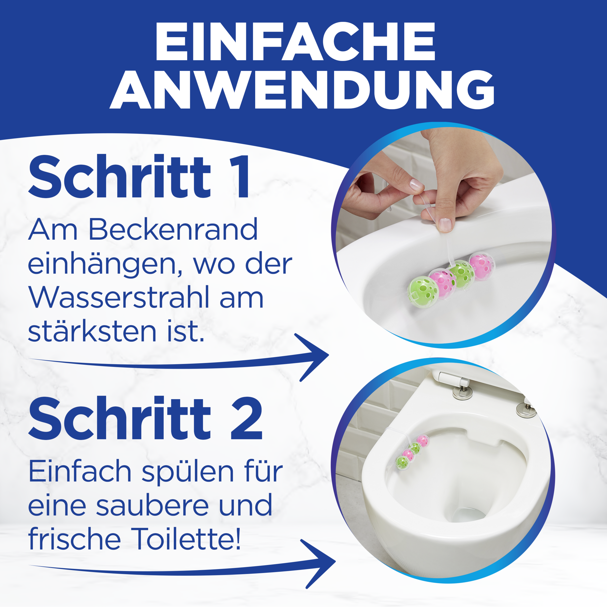 Hängen Sie WC FRISCH Kraft Aktiv an den Rand Ihrer Toilettenschüssel. Passen Sie es an den Wasserfluss an. Ersetzen Sie es, wenn die Kugeln leer sind.