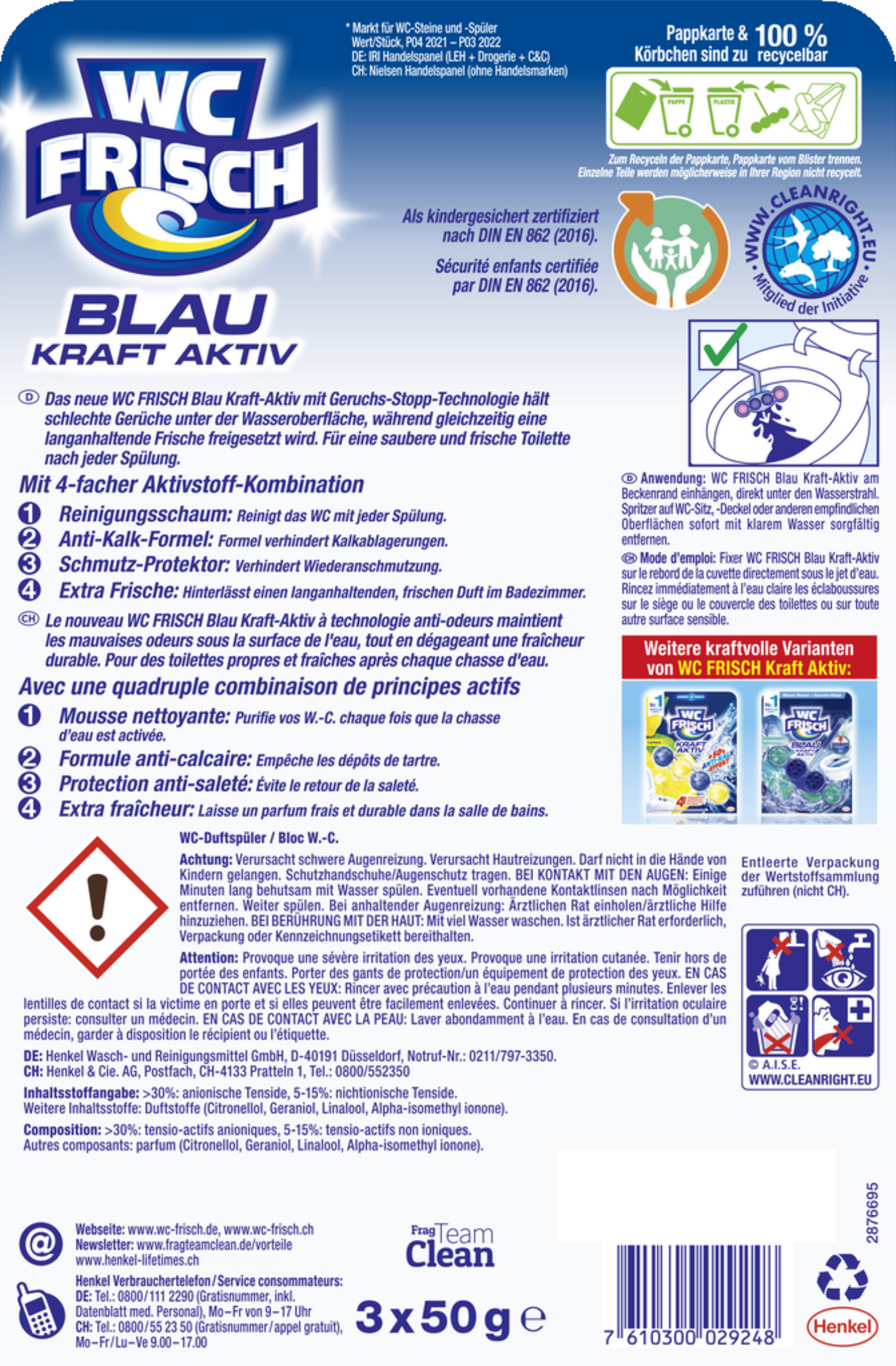 WC FRISCH Kraft Aktiv am Beckenrand einhängen, direkt unter den Wasserstrahl. Spritzer auf WC-Sitz,-Deckel oder anderen empfindlichen Oberflächen sofort mit klarem Wasser sorgfältig entfernen. Entleerte Verpackung der Wertstoffsammlung zuführen.