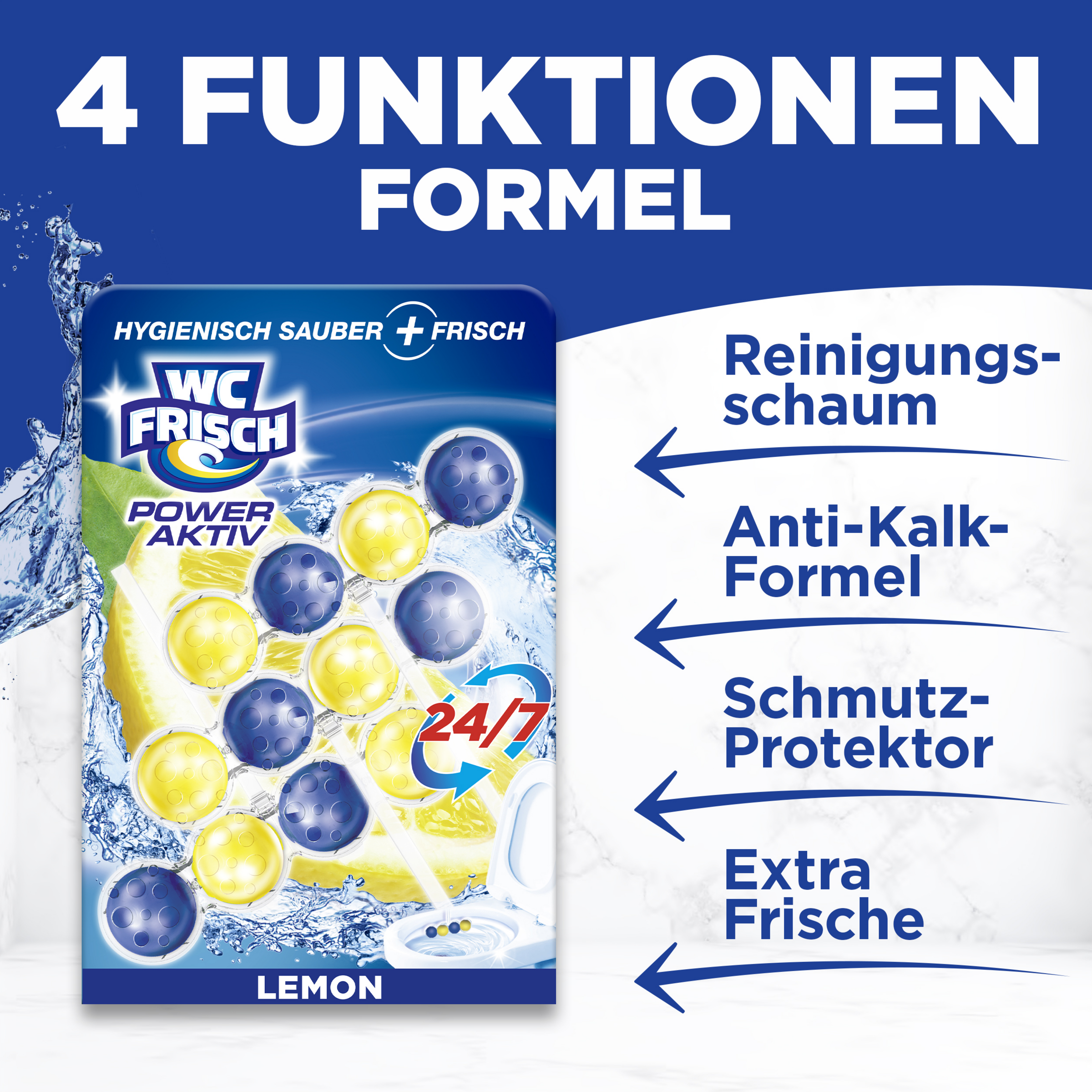 Hängen Sie das Produkt einfach in die Toilettenschüssel, passen Sie es an den Wasserfluss an und erleben Sie Sauberkeit und intensiven Duft mit jeder Spülung! WC FRISCH Kraft Aktiv hält für bis zu 250 Spülungen.