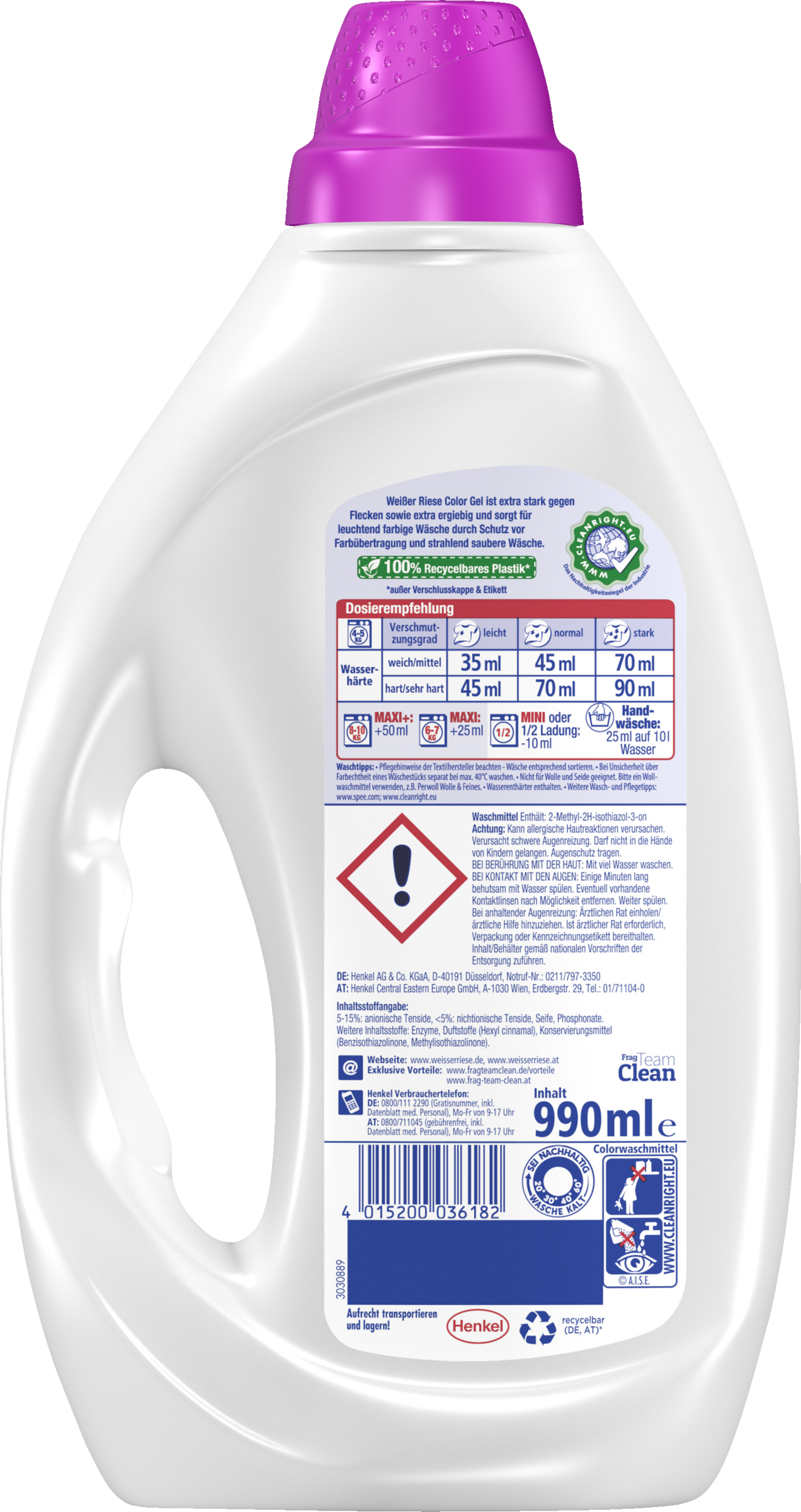 Waschtemperatur: Alle Temperaturen von 20 °C bis 60 °C. Weißer Riese Color Gel ist für dunkle und bunte Textilien geeignet. Pflegehinweise der Textilhersteller beachten - Wäsche entsprechend sortieren. Bei Unsicherheit über Farbechtheit eines Wäschestücks separat bei max. 40°C waschen.