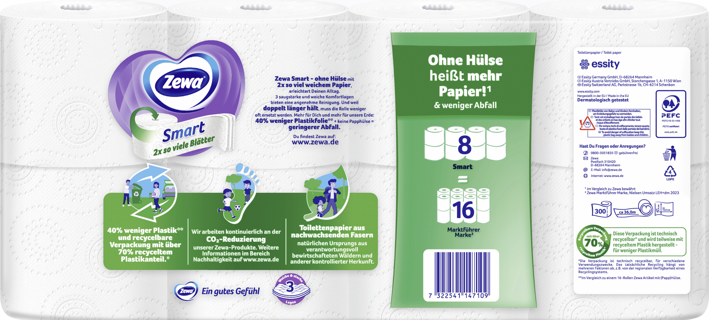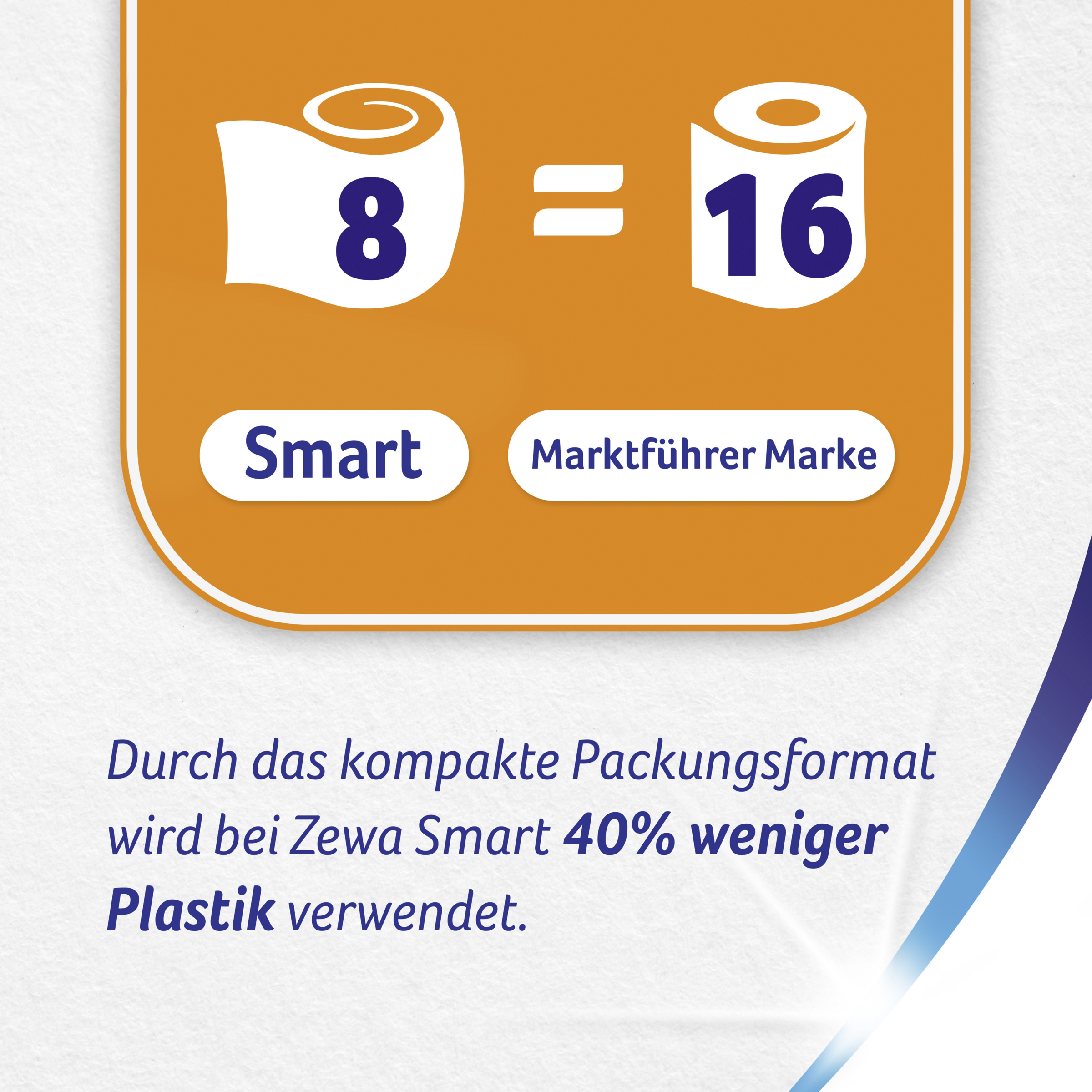 Zewa Smart & Ultra Smart: Ohne Hülse heißt mehr Papier! Du willst mehr? Mehr für dich und unsere Umwelt? Kein Problem, denn genau hierfür wurden Zewa Smart und Ultra Smart entwickelt: Ohne Papphülse und mit doppelt so vielen Blättern bieten sie mehr für alle. Denn weil doppelt länger hält, muss die Rolle weniger oft ersetzt werden und keine Hülse bedeutet natürlich geringeren Ressourceneinsatz sowie weniger Abfall. Zudem sind die Päckchen besonders klein, haben aber genauso viel Inhalt wie die "großen" Zewa bewährt oder Ultra Senses. Dadurch sind sie nicht nur angenehmer zu transportieren, sondern sparen 40% Plastik und somit auch Müll und CO2.