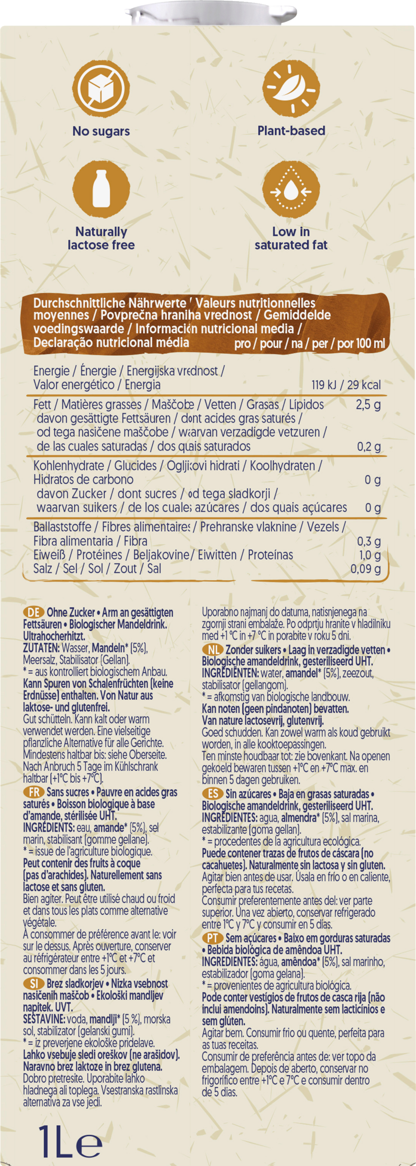 Wasser, MANDELN* (5%), Meersalz, Stabilisator (Gellan).