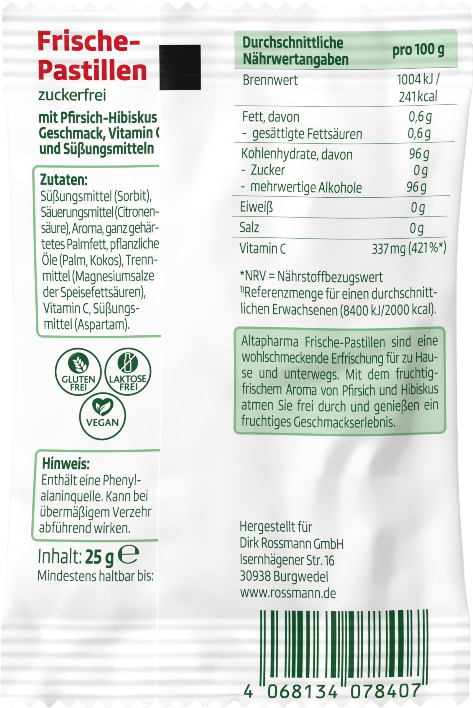 Altapharma Frische-Pastillen sind eine Erfrischung für zu Hause und unterwegs. Mit dem fruchtigfrischem Aroma von Pfirsich und Hibiskus atmen Sie frei durch und genießen ein fruchtiges Geschmackserlebnis.