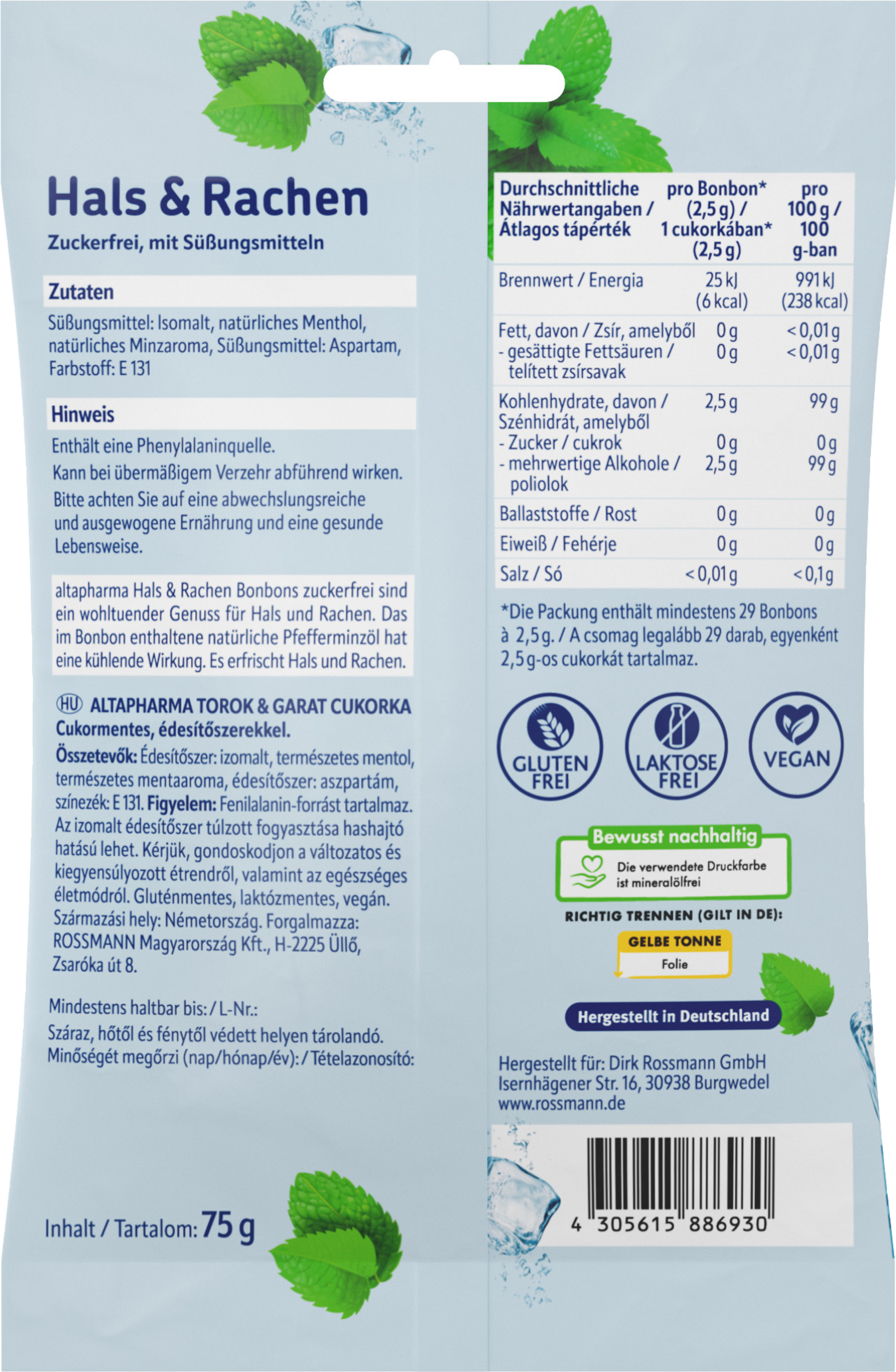 Altapharma Hals& Rachen Bonbons zuckerfrei mit Süßungsmitteln sind ein wohltuender Genuss für Hals und Rachen.
