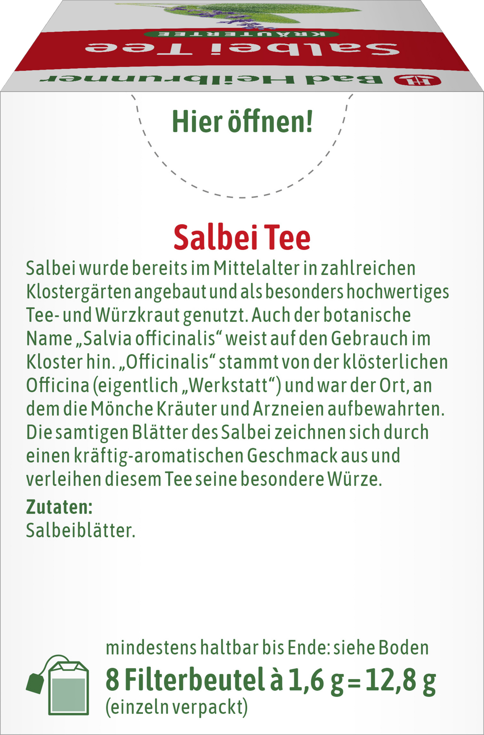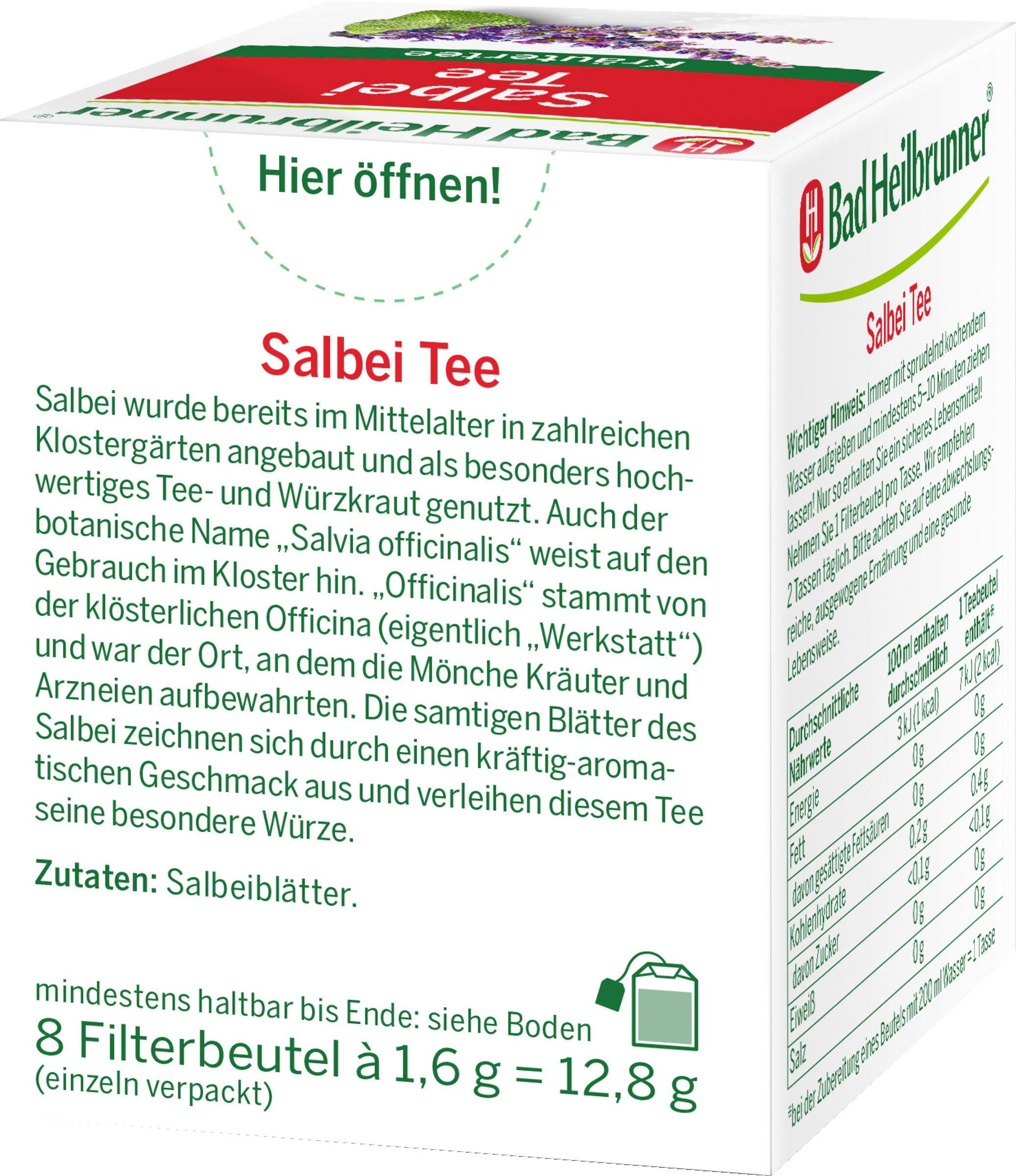 Salbei wurde bereits im Mittelalter in zahlreichen Klostergärten angebaut und als besonders hochwertiges Tee- und Würzkraut genutzt. Die samtigen Blätter des Salbei zeichnen sich durch einen kräftig-aromatischen Geschmack aus und verleihen diesem Tee seine besondere Würze.