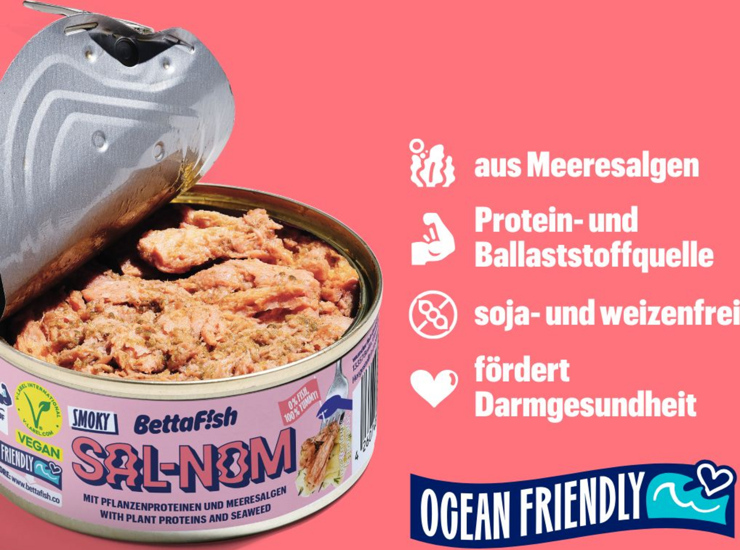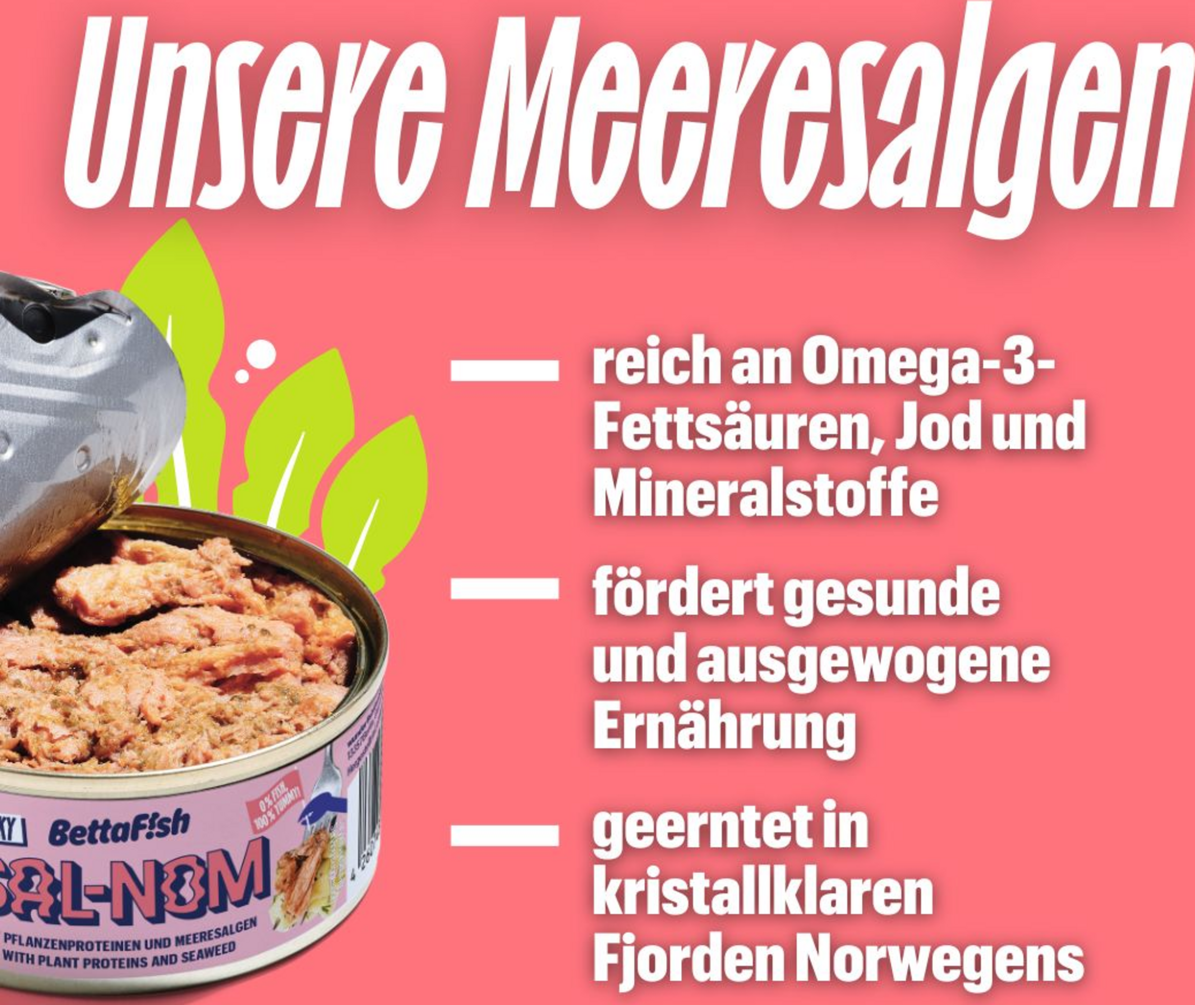 BettaF!sh SAL-NOM ist unsere Antwort auf den beliebtesten Fisch weltweit! Aus europäischen Meeresalgen und pflanzlichen Proteinen von der Ackerbohne und Erbse ist SAL-NOM die köstliche Alternative zum heiß geräucherten Lachs - 100% pflanzlich, frei von Weizen und Soja und deine perfekte Quelle für Omega-3-Fettsäuren.