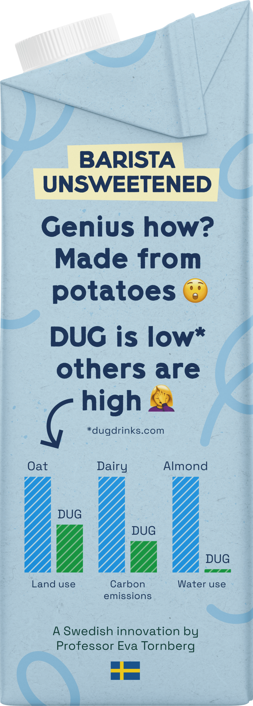 Die Milchalternative der schwedischen Marke DUG ist der erste Kartoffeldrink seiner Art auf dem Markt. Sie wird mithilfe einer patentierten Emulsionstechnologie produziert, die von Professorin Eva Tornberg auf Grundlage wissenschaftlicher Forschung entwickelt wurde.