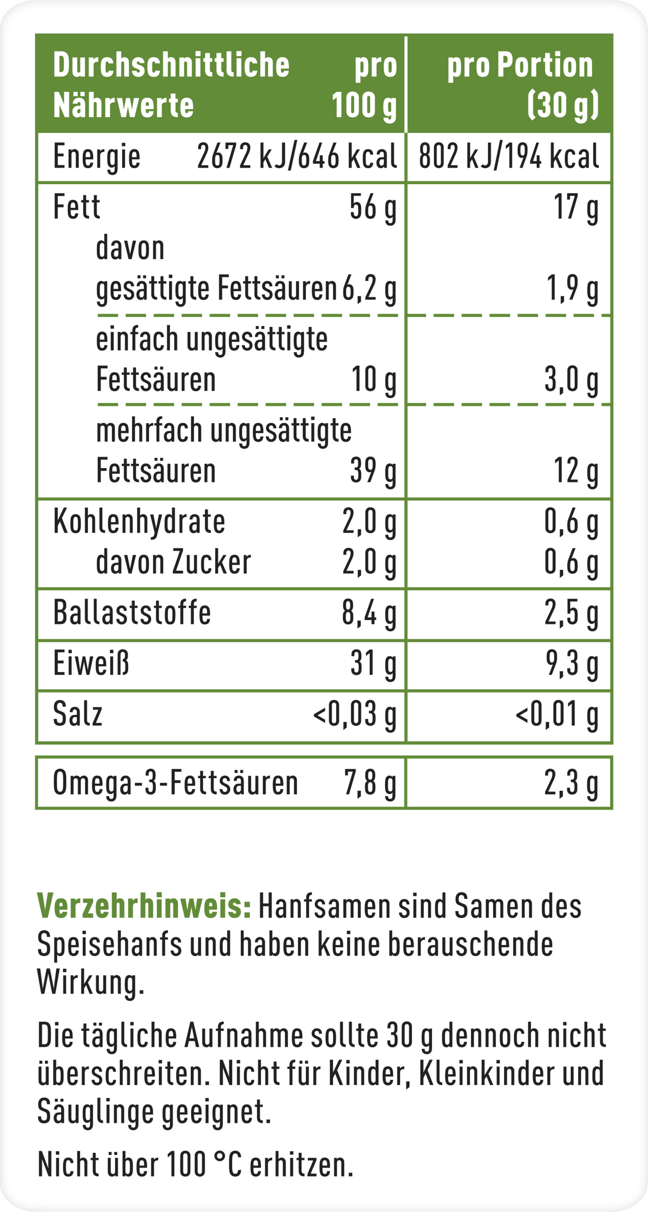 Die tägliche Aufnahme sollte 30 g dennoch nicht überschreiten. Nicht für Kinder, Kleinkinder und Säuglinge geeignet. Bitte achten Sie auf eine abwechslungsreiche und ausgewogene Ernährung und eine gesunde Lebensweise.