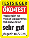 Fleischlos genussvoll 100% Bio – 100% Made in Germany: Unsere enerBiO Vegane Bratwürstchen sind wahre fleischlose proteinreiche Alleskönner – ob klassisch als Grillwurst, als herzhafte Salatbeilage, in Suppen oder Eintöpfen, Ihrer Reis- und Nudelpfanne oder im Kartoffelsalat. Unser Tipp: Genießen Sie unsere veganen Bratwürstchen doch einmal in zwei Hot Dog Brötchenhälften, gemeinsam mit Röstzwiebeln, Gurkenscheiben und Sauce – fertig ist der vegane Hot Dog!