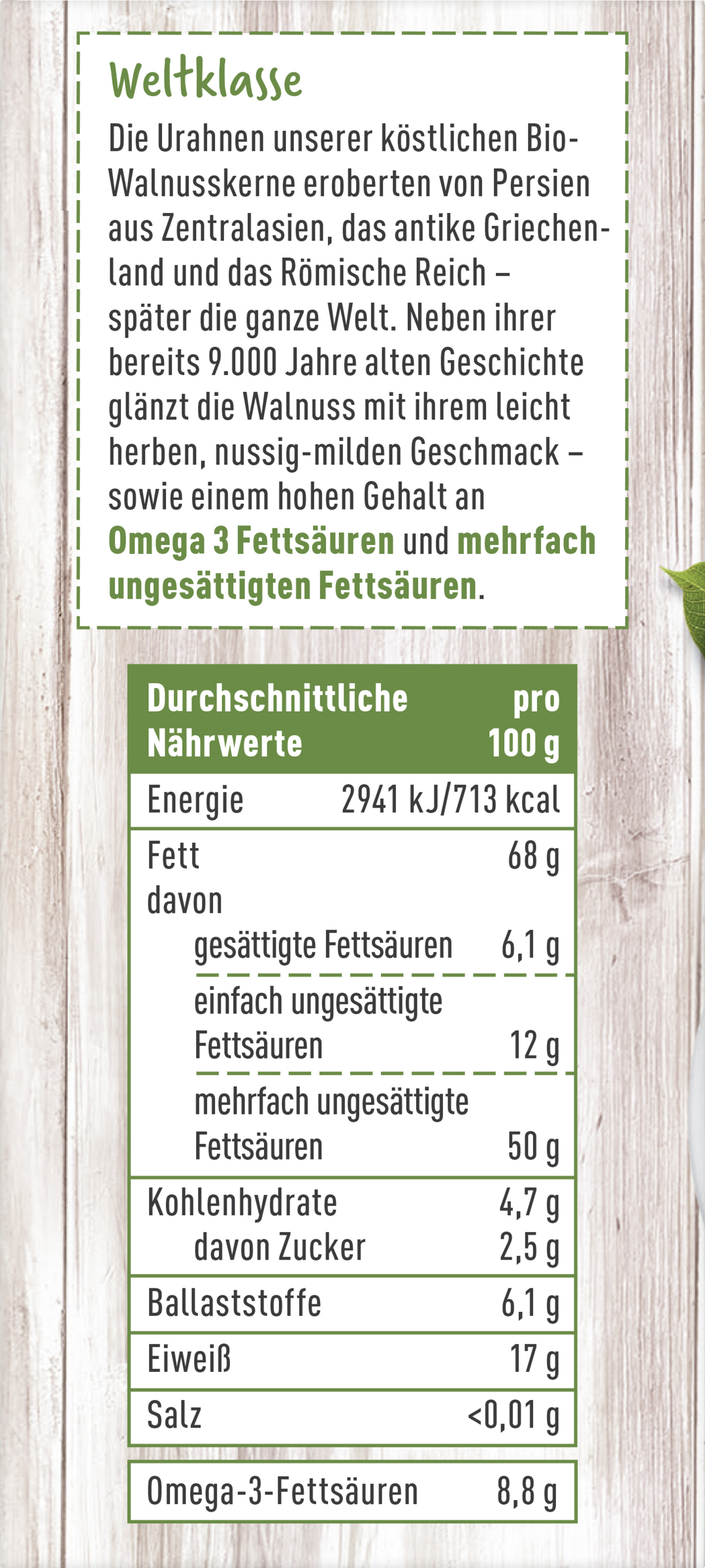 Die Urahnen unserer köstlichen Bio Walnusskerne eroberten von Persien aus Zentralasien, das antike Griechenland und das Römische Reich – später die ganze Welt. Neben ihrer bereits 9.000 Jahre alten Geschichte glänzt die Walnuss mit ihrem leicht herben, nussig-milden Geschmack – sowie einem hohen Gehalt an Omega 3 Fettsäuren und mehrfach ungesättigten Fettsäuren.