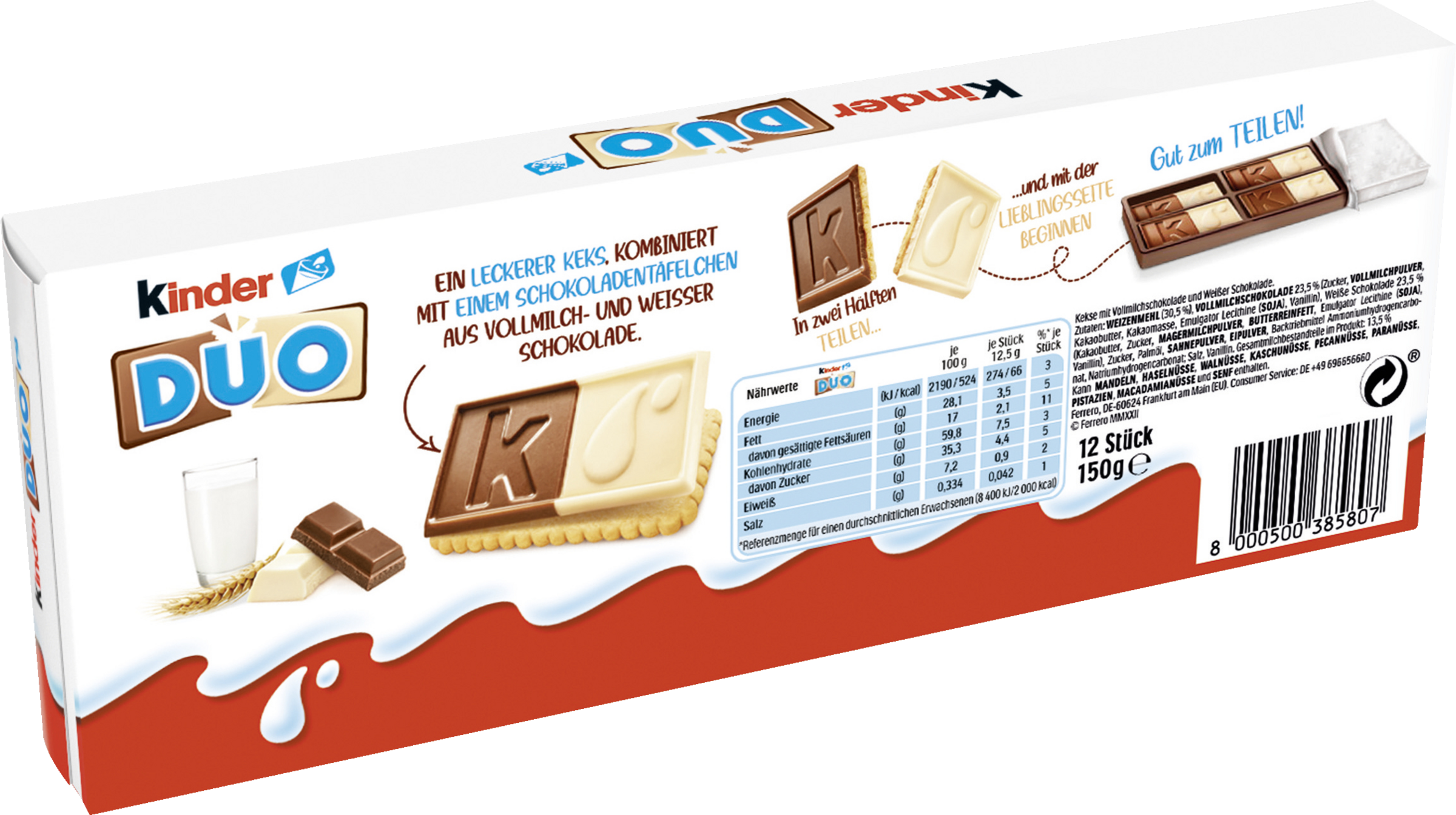 WEIZENMEHL (30,5 %), VOLLMILCHSCHOKOLADE 23,5 % (Zucker, VOLLMILCHPULVER, Kakaobutter, Kakaomasse, Emulgator Lecithine (SOJA), Vanillin), Weiße Schokolade 23,5 % (Kakaobutter, Zucker, MAGERMILCHPULVER, BUTTERREINFETT, Emulgator Lecithine (SOJA), Vanillin), Zucker, Palmöl, SAHNEPULVER, EIPULVER, Backtriebmittel: Ammoniumhydrogencarbonat, Natriumhydrogencarbonat; Salz, Vanillin.Gesamtmilchbestandteile im Produkt: 13,5 %