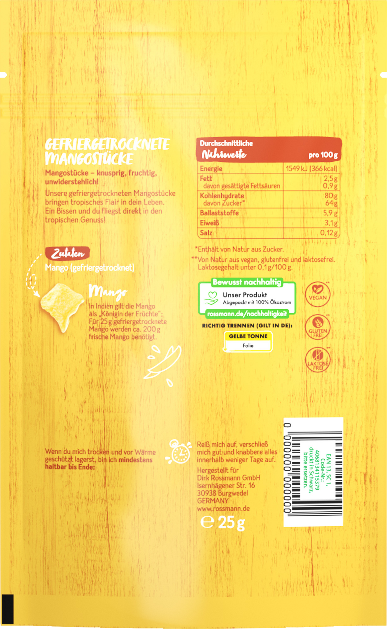 Unsere gefriergetrockneten Mangostücke bringen tropisches Flair ib dein Leben. Ein Bissen und du fliegst direkt in den tropischen Genuss!