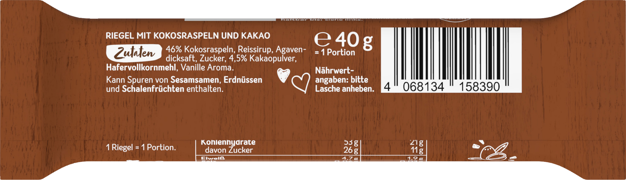 46% Kokosraspeln, Reissirup, Agavendicksaft, Zucker, 4,5% Kakaopulver, HAFERVOLLKORNMEHL, Vanille Aroma.