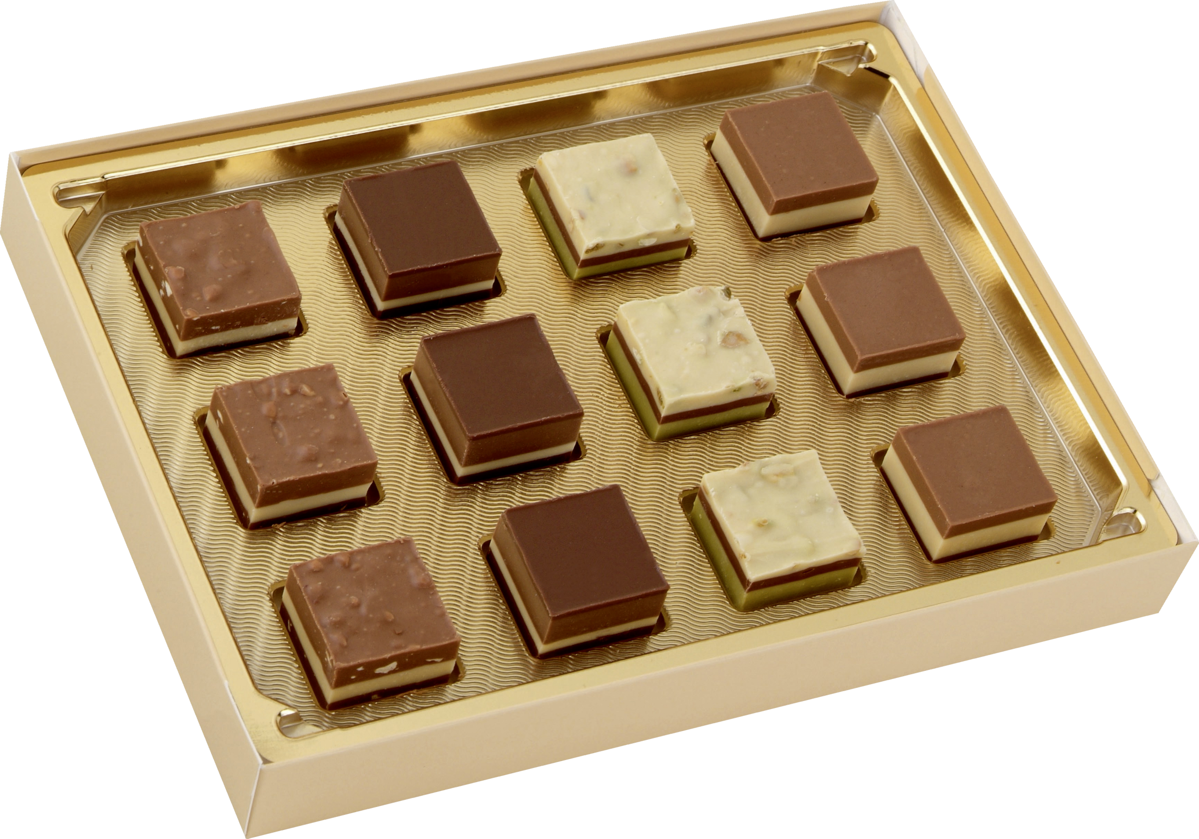 Eine feine Auswahl von Haselnuss-, Pistazien- und Mandel-Nougat-Pralinés
