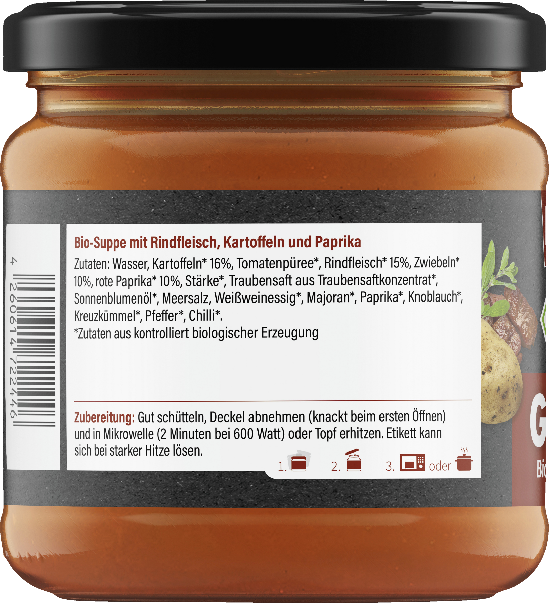 Wasser, Kartoffeln *(16%) , Tomatenpüree*, Rindfleisch* (15%), Zwiebeln* (10%), rote Paprika* (10%), Stärke*, Traubensaft* aus Traubensaftkonzentrat, Sonnenblumenöl*, Gewürze (Paprika*, Knoblauch*, Kreuzkümmel, Pfeffer*, Chili*), Meersalz, Weißweinessig*, Majoran*.