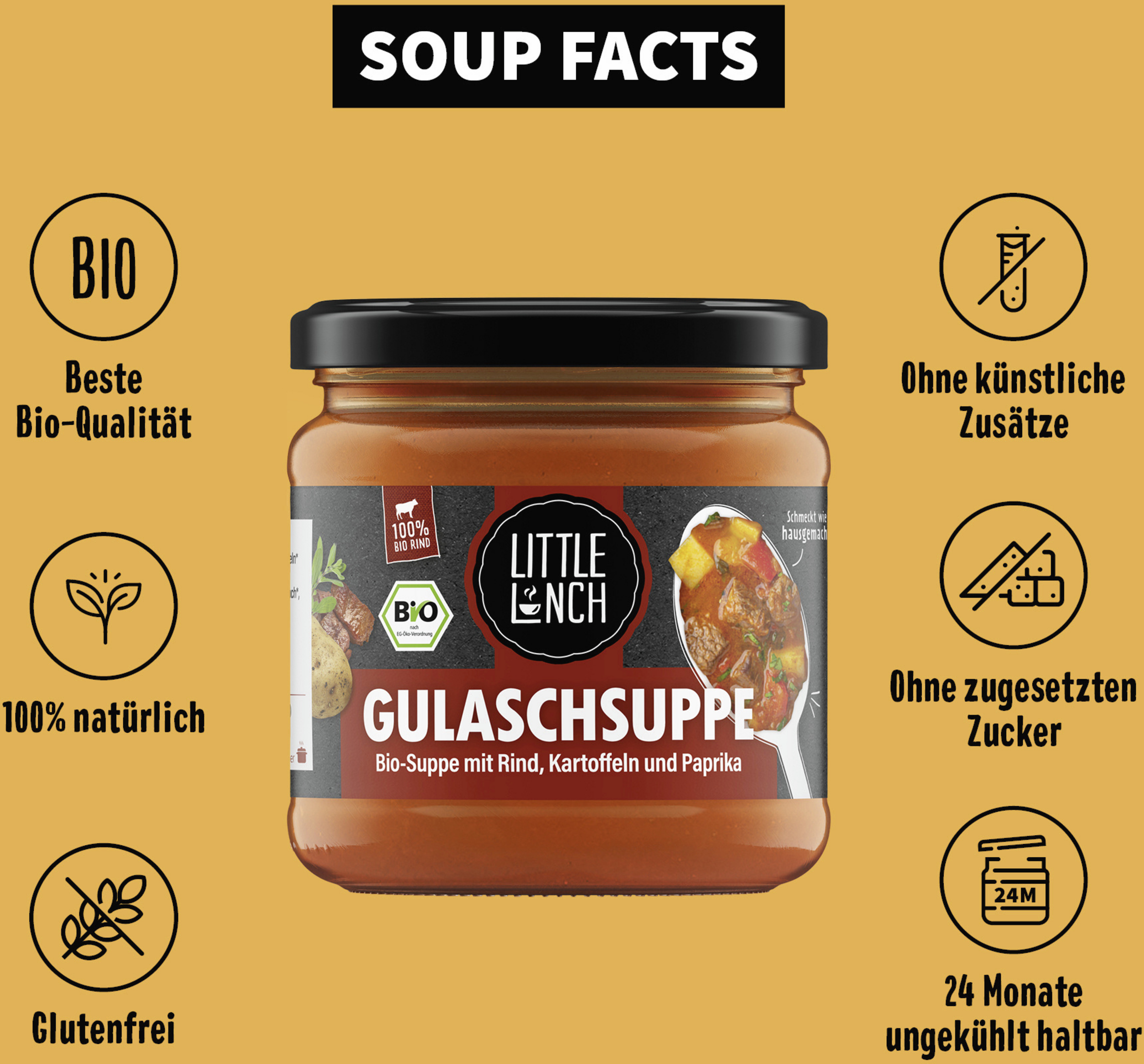 Wie alle Produkte von Little Lunch werden auch für die Gulaschsuppe nur beste Bio-Zutaten verarbeitet. Künstliche Zusatzstoffe, Geschmacksverstärker und Konservierungsstoffe kommen nicht ins Glas. Die Zubereitung ist einfach und stressfrei und daher perfekt, wenn es mal schnell gehen muss.