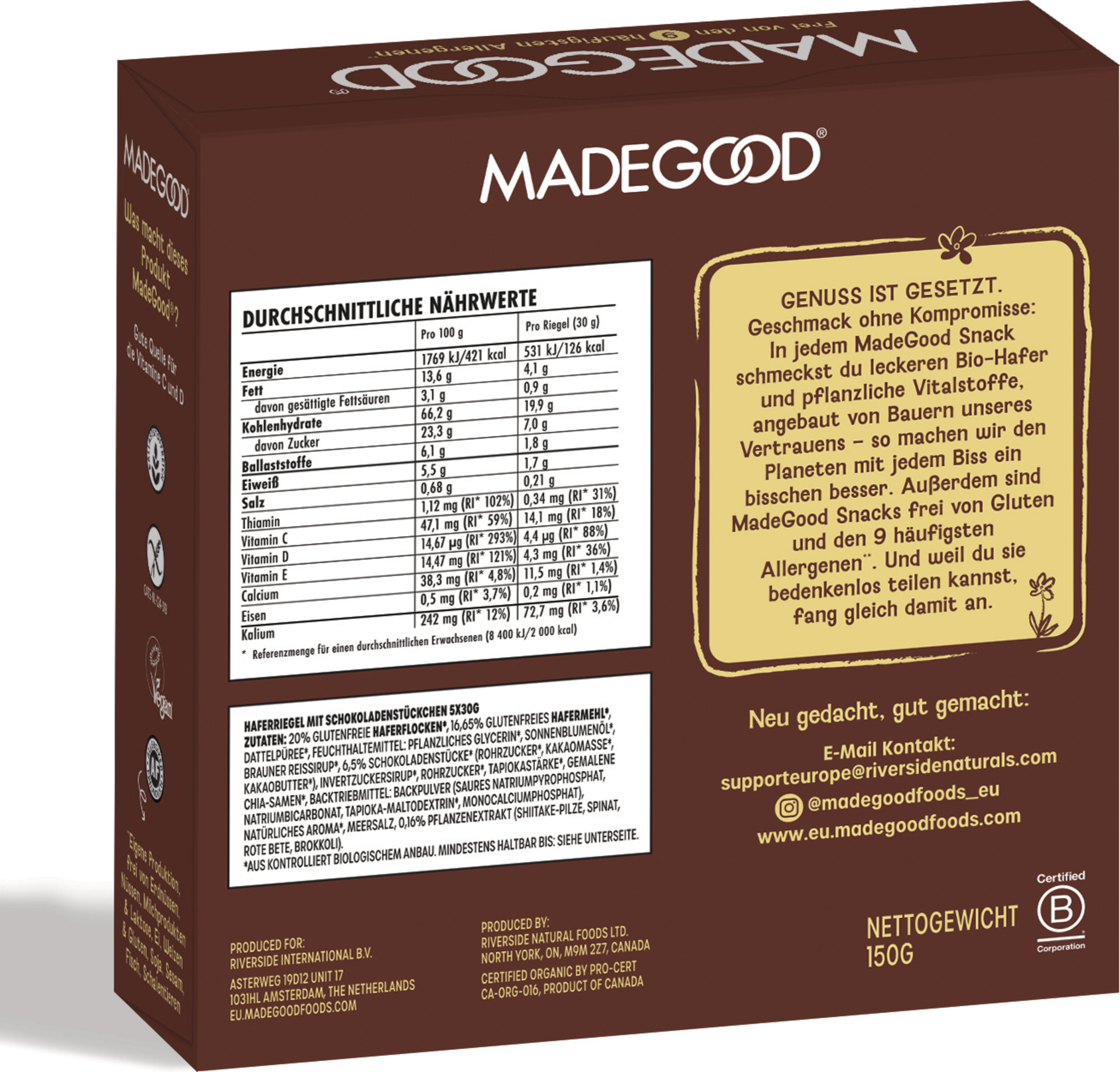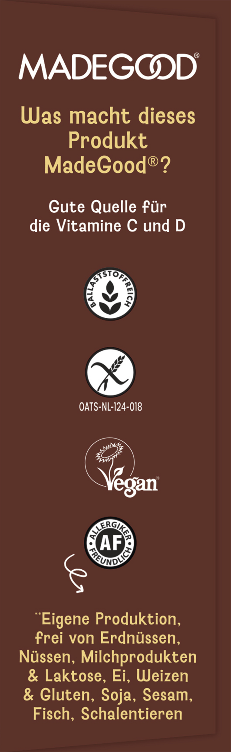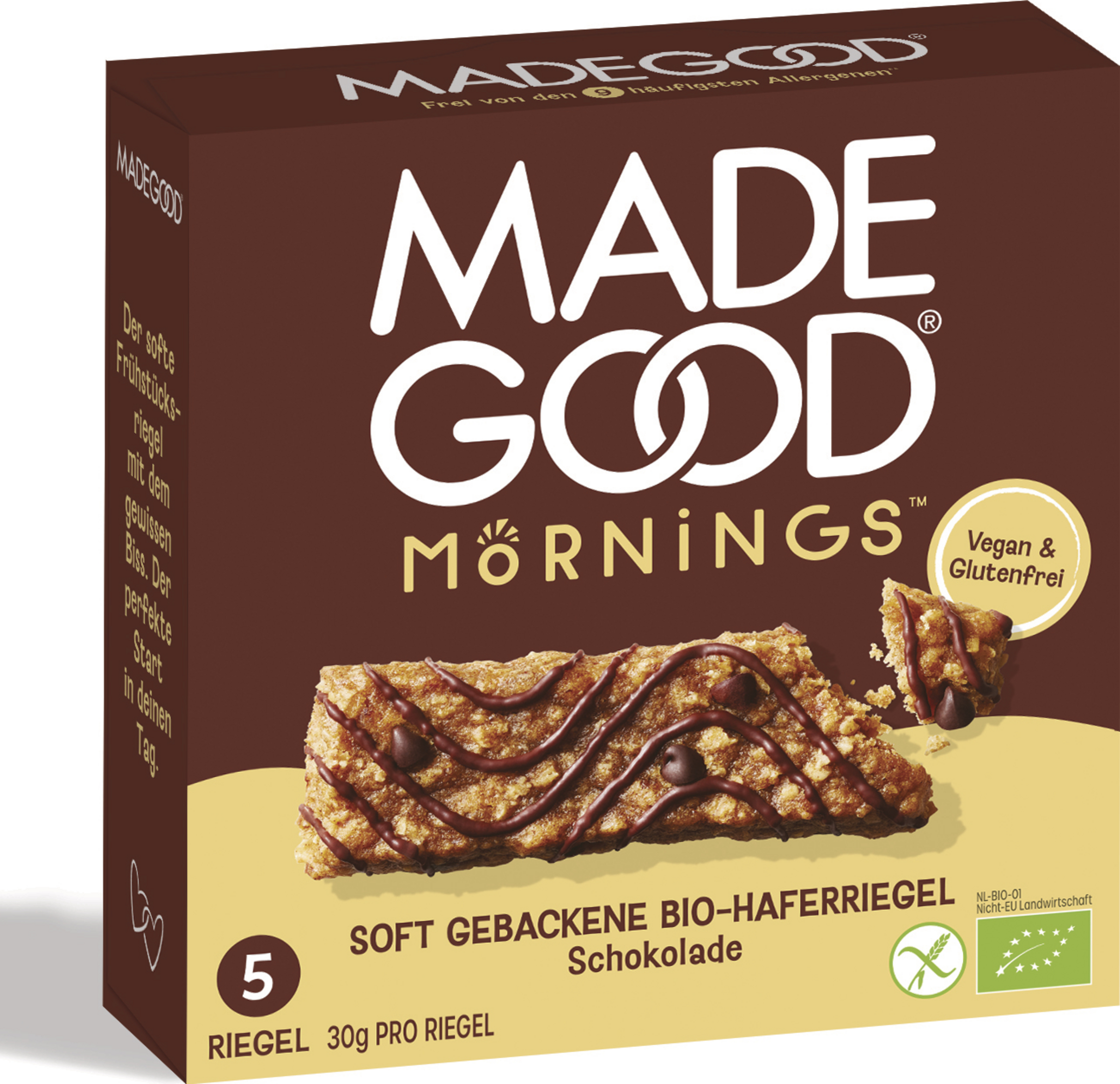 Mache deinen Morgen mit MadeGood Mornings Chocolate Chip Soft Baked-Haferriegeln zu etwas Besonderem. Alles schön kompakt in einem praktischen Riegel. Weich und chewy mit veganen Schokoladenstückchen und veganer Schokomasse. Eine süße Verführung für einen guten Start in den Tag. Mitglutenfreiem Hafer und Bio-Zutaten gebacken und frei von den häufigsten Allergenen.