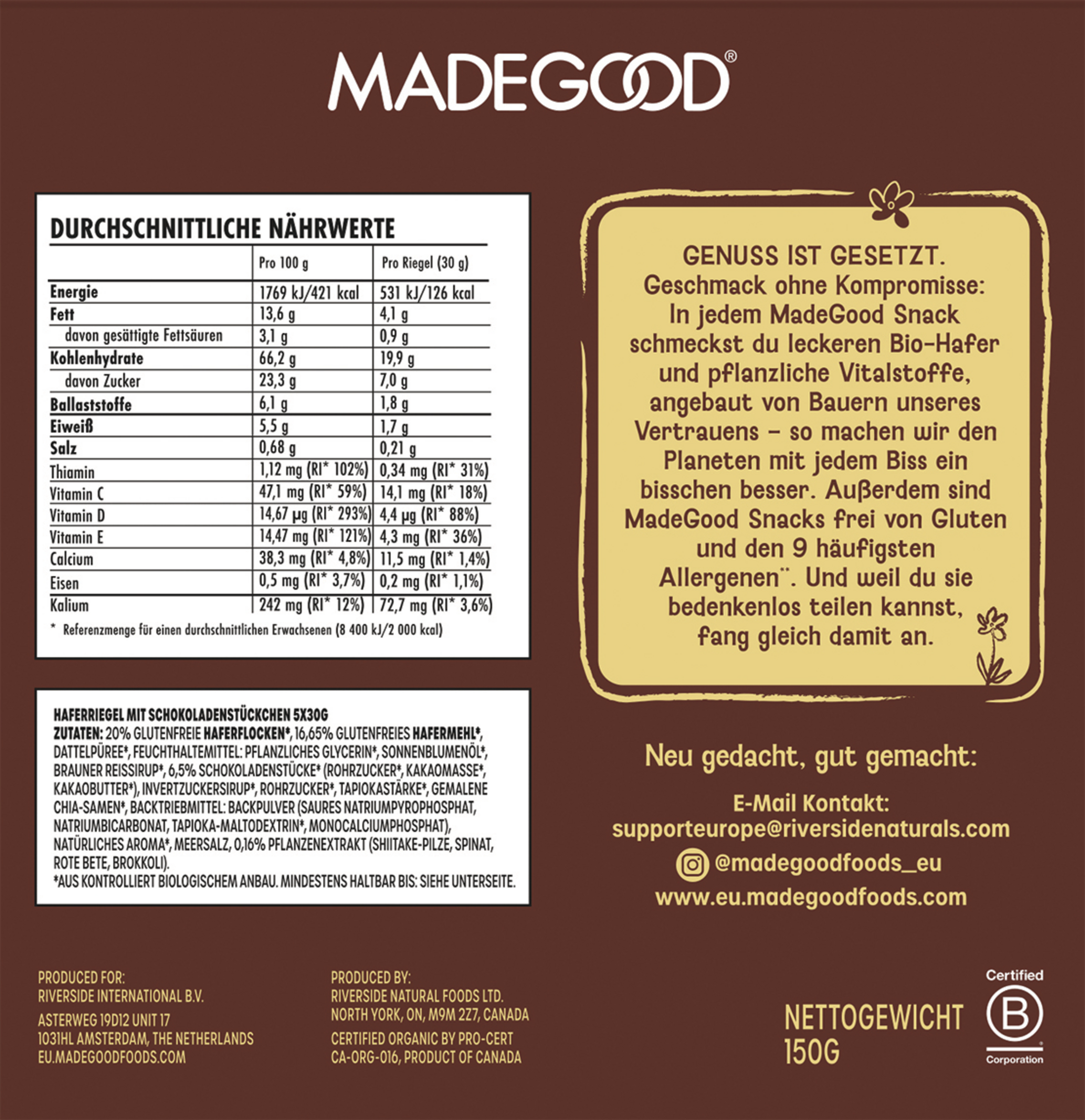 20% Glutenfreie HAFERFLOCKEN*, 16,65% Glutenfreies HAFERMEHL*, Dattelpüree*, Feuchthaltemittel: Pflanzliches Glycerin*, Sonnenblumenöl*, Brauner Reissirup*, 6,5% Schokoladenstücke* (Rohrzucker*, Kakaomasse*,Kakaobutter*), Invertzuckersirup*, Rohrzucker*, Tapiokastärke*, Gemahlene Chia-Samen*, Backtriebmittel: Backpulver (Saures Natriumpyrophosphat, Natriumbicarbonat, Tapioka-Maltodextrin*, Monocalciumphosphat), NatürlichesAroma*, Meersalz, 0,16% Pflanzenextrakt (Shiitake-Pilze, Spinat, Rote Bete, Brokkoli).