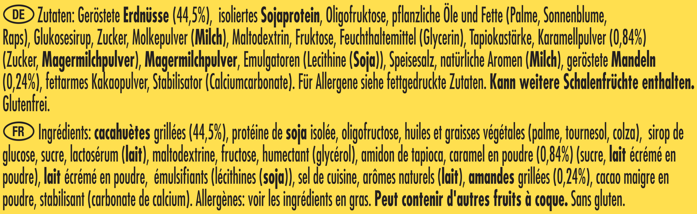 Geröstete ERDNÜSSE (44,5%), isoliertes SOJAPROTEIN, Oligofruktose, pflanzliche Öle und Fette (Palme, Sonnenblume, Raps), Glukosesirup, Zucker, MOLKEPULVER (MILCH), Maltodextrin, Fruktose, Feuchthaltemittel (Glycerin), Tapiokastärke, Karamellpulver (0,84%) (Zucker, MAGERMILCHPULVER), MAGERMILCHPULVER, Emulgatoren (LECITHINE (SOJA)), Speisesalz, natürliche Aromen (MILCH), geröstete MANDELN (0,24%), fettarmes Kakaopulver, Stabilisator (Calciumcarbonate).