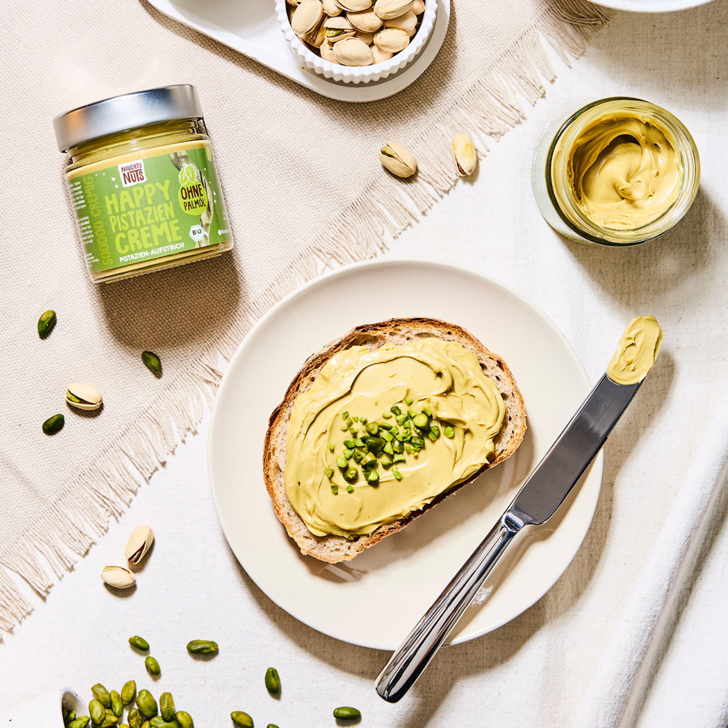 Die Happy Pistazien Creme bringt das volle Aroma gerösteter Pistazien direkt auf deinen Löffel – cremig, nussig und mit einer feinen Prise Salz perfekt abgerundet. Ein Geschmackserlebnis, das nicht nur Nussfans begeistert!