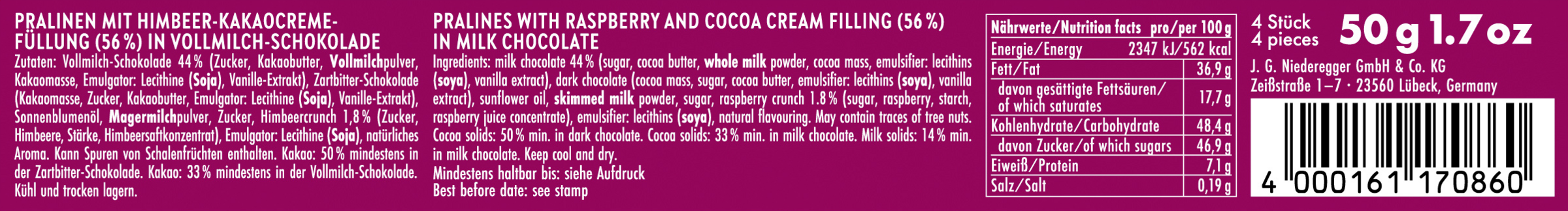 Vollmilch-Schokolade 44 % (Zucker, Kakaobutter, VOLLMILCHpulver, Kakaomasse, Emulgator: Lecithine (SOJA), Vanille-Extrakt), Zartbitter-Schokolade (Kakaomasse, Zucker, Kakaobutter, Emulgator: Lecithine (SOJA), Vanille-Extrakt), Sonnenblumenöl, MAGERMILCHpulver, Zucker, Himbeercrunch 1,8 % (Zucker, Himbeere, Stärke, Himbeersaftkonzentrat), Emulgator: Lecithine (SOJA), natürliches Aroma. Kann Spuren von SCHALENFRÜCHTEN enthalten.