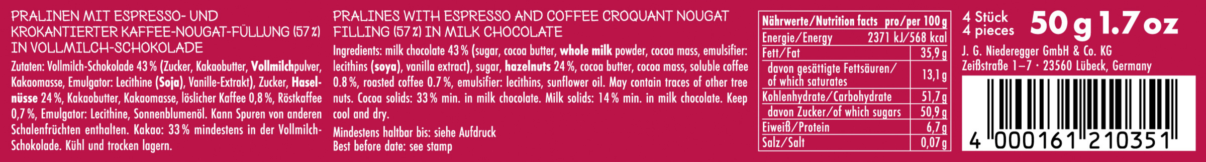Vollmilch-Schokolade 43 % (Zucker, Kakaobutter, VOLLMILCHpulver, Kakaomasse, Emulgator: SOJA-Lecithine, Vanille-Extrakt), Zucker, HASELNÜSSE 24 %, Kakaobutter, Kakaomasse, löslicher Kaffee 0,8 %, Röstkaffee 0,7 %, Emulgator: Sonnenblumen-Lecithine, Sonnenblumenöl.