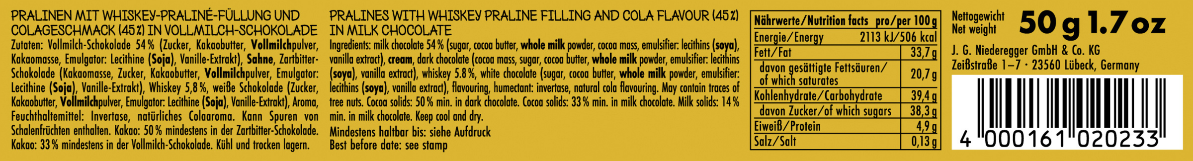 Pralinen mit Whiskey-Trüffel-Füllung und Colageschmack 45% in Vollmilch-Schokolade. Der beliebte Drink kommt als hochwertige Trüffelkomposition.