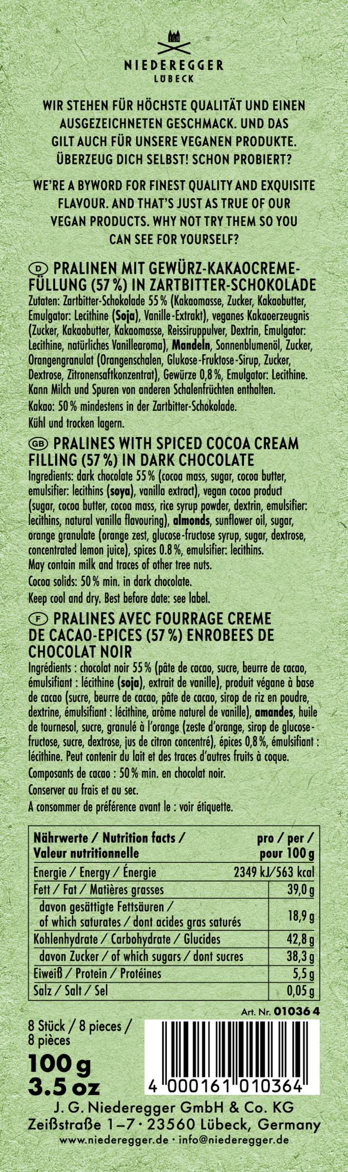 Niederegger goes VEGAN - mit der veganen Vielfalt für den ganz bewussten Genuss! Sie kommt ganz ohne tierische Produkte aus und dabei muss garantiert nicht auf die unvergleichliche Niederegger Qualität verzichtet werden.