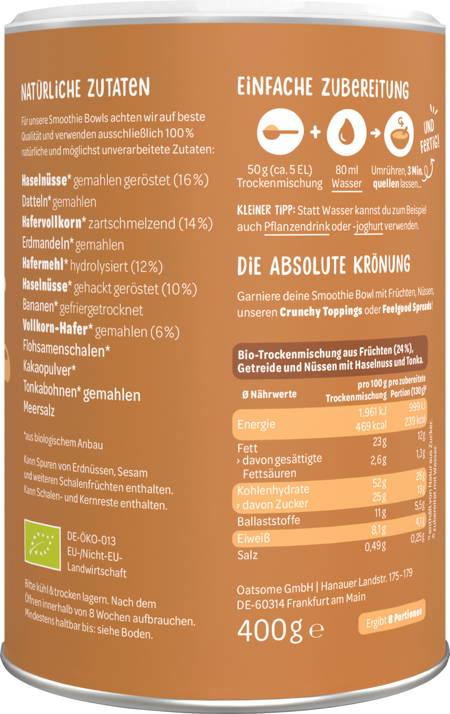 HASELNÜSSE* gemahlen geröstet (16%) Datteln* gemahlen HAFERVOLLKORN* zartschmelzend (14%) ERDMANDELN* gemahlen HAFERMEHL* hydrolysiert (12%) HASELNÜSSE* gehackt geröstet (10%) Bananen* gefriergetrocknet VOLLKORN-HAFER* gemahlen (6%) Flohsamenschalen* Kakaopulver* Tonkabohnen* gemahlen Meersalz.